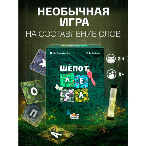 Шепот Леса – это несложная и атмосферная настольная игра для всей семьи и детей от 8 лет на составление слов, в ходе которой вам предстоит овладеть языком растений деревьев, чтобы постараться первому разобрать, о чем же они там толкуют! В ходе этой логической настолки для компании перед вами раскинется игровое поле из карт разных цветов с буквами, из которых вам нужно будет собрать слово всего за 1 минуту. Казалось бы, всё просто – но не тут-то было! Придется решать, взять слово покороче или же попробовать придумать что-то подлиннее, использовать небольшой набор букв или же стараться охватить как можно большее количество карточек, искусно повышая свое влияние на поле и многое другое! Вас ждет целая череда раундов с напряженным мыслительным процессом и выставлением кубиков на использованные карты, чтобы распределять свое влияние по уголкам этого чудного леса. Набрав нужное количество, вы сможете стать Лидером и забрать карточку с буквой себе, выложив на её место новую лицом вниз с возможностью разместить туда свой кубик. Если на поле появится группа из трёх таких соседних мест с кубиками одного игрока, этот игрок станет Старейшиной и получит из колоды доп. карту, что потом будет важна при определении победителя. Соревнуйтесь в воображении, словарном запасе и фантазии и докажите, что являетесь сильнейшим друидом и мастером словесных баталий этой веселой настолки для подростков! Подходит для 2-5 игроков.