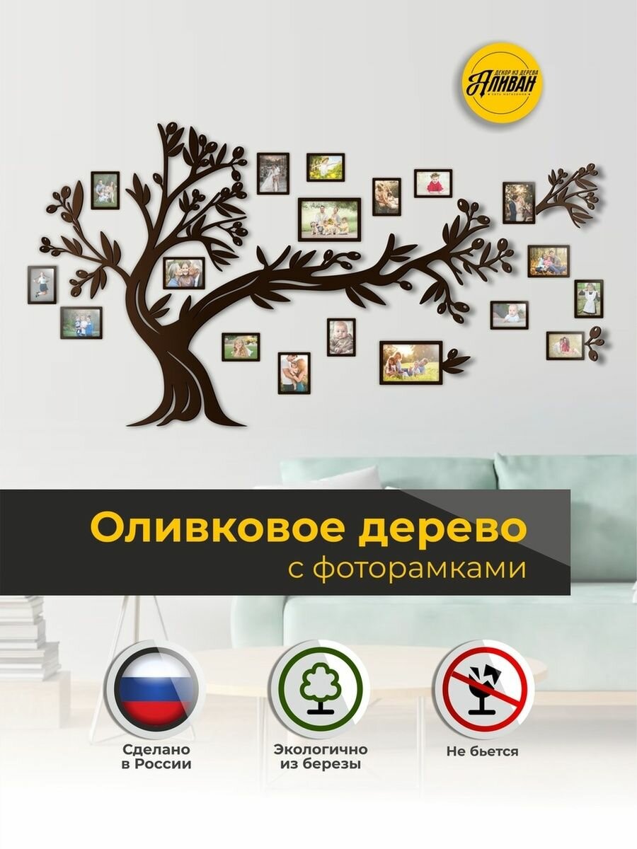 Семейное генеалогическое дерево на стену . Настенное панно - оливковое дерево изготовлено из березовой фанеры высшего сорта шлифованной сорт 1-2, загрунтовано и окрашено профессиональной, гип аллергенной краской в зеленый цвет (изумрудный), толщина декоративных элементов 3 мм, толщина фоторамок 6мм. В комплекте к рамкам идет оргстекло ( когда вставляете фото, надо снять пленку защитную с двух сторон). Набор с фоторамками легко впишется в любой интерьер, позволит собрать фото близких вам людей на видном месте. Фотографии в фоторамках можно легко поменять. Деревянное панно на стену (настенное панно дерево декоративное, фоторамки набор) можно закрепить на жидкие гвозди, горячий клей пистолет или двусторонний скотч (в комплект не входят), фоторамки можно повесить на стену с помощью специальных креплений, исключающих сверление стен (идут в комплекте с рамками), с оформлением стены справится даже девушка. Коллаж из фоторамок Семейное дерево состоит из отдельных элементов, которые размещаются на стену и образуют целостное панно - декоративное дерево (настенные декорации требуют самостоятельной сборки). В состав набора входят 18 рамок толщиной 6 мм нескольких размеров: 21х30 а4 -2 шт, 13х18-10шт, 15х20 а5- 6 шт. Все фоторамки универсальные, в наборе могут быть размещены вертикально или горизонтально. Может использоваться как декор в спальню, гостиную, кухню и иные помещения квартиры, для дома. Панно декоративное семейное дерево с фоторамками на стену надежно упаковано. Хороший подарок подруге, маме, бабушке, жене, девушке, сестре, крестной, тете на годовщину, юбилей, свадьбу, Новый год, новоселье и любой другой праздник. Дерево и рамки для фото на стену – это не интерьерные наклейки, а объемный 3d декор, 3Д эффект достигается за счет толщины изделия. В нашем магазине вы можете заказать дополнительные фоторамки в любых цветах и размерах. Переходите на страницу нашего бренда кликнув на логотип. Семейное дерево станет изюминкой в вашем доме и освежит уже привычный интерьер