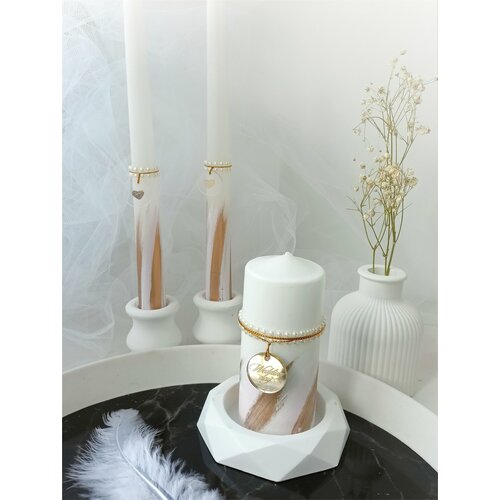 Свечи для церемонии зажжения семейного очага на свадьбе выполнены в стиле минимализм нюдового оттенка с добавлением золотистых или серебристых оттенков (в зависимости от артикула), на большой свече медальон с гравировкой "Wedding day", на двух длинных родительских свечах - круглые медальоны с золотистыми/серебристыми сердечками.
