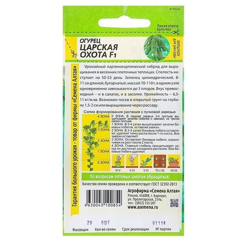 Огурец Царская Охота F1 5 шт. Урожайный партенокарпический гибрид с пучковой завязью для выращивания в весенних плеточных теплицах. Спелость наступает на 50-53 день. Зеленец цилиндрический, 10-11 см длиной, бугорчатый, массой 70-110 г. Вкус превосходный – и в салатах, и в засолке. Урожайность – 6,5-11 кг/кв.м. Устойчив к комплексу заболеваний. Выращивают прямым посевом семян в грунт и рассадным способом. Семена в открытый грунт высевают, когда почва прогреется до 15-20°С днем и не ниже 8°С ночью. Бороздки или лунки, заполненные субстратом из торфа, навозного перегноя, песка и минеральных удобрений, поливают, заделывают в них семена на глубину 1,5-2,0 см, мульчируют торфом или перепревшим навозом и накрывают пленкой. В остекленные или пленочные теплицы, тоннели с начала мая высевают семена или с середины мая высаживают 20-25-дневную рассаду, имеющую 3-5 настоящих листьев. Схема посадки 70х40 см. Не требует формировки.