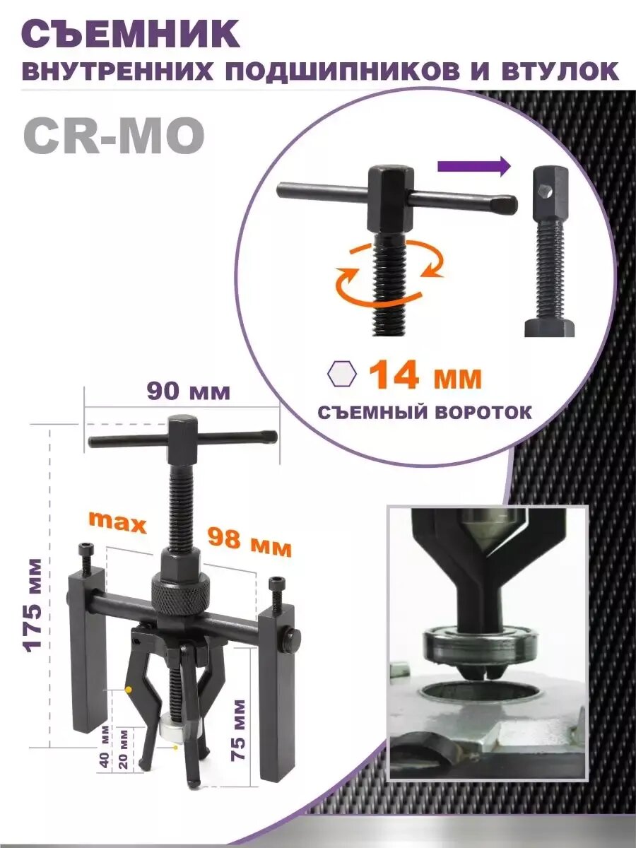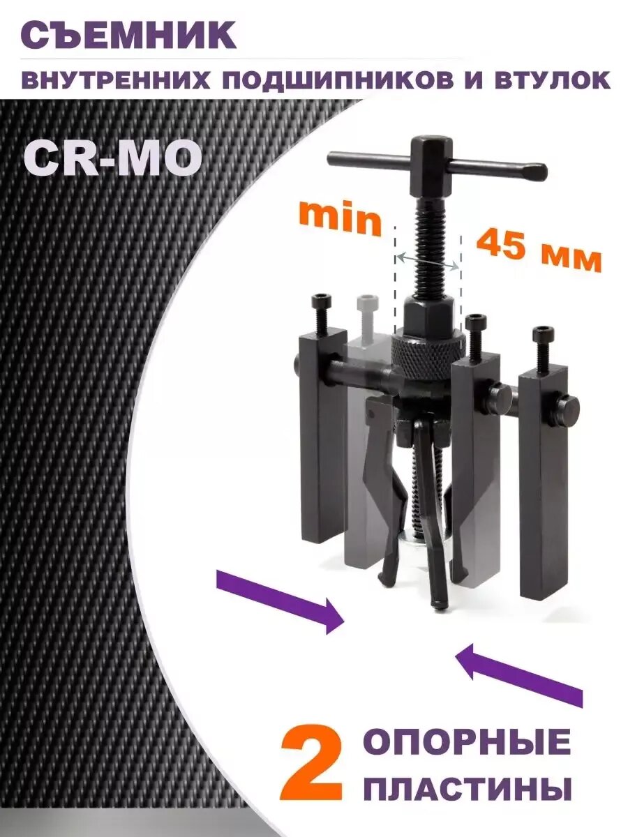 Съемник подшипников и втулок с внутренним захватом (Ø захвата:13-38мм) от бренда Partner. Инструмент который используется для снятия внутренних подшипников, шкивов, валов с поворотным захватом. Он состоит из трех подвижных лапок, которые дают возможность фиксации в различных положениях, выпрессовочного винта с центровочным конусом и плечики. Когда лапки расположены вокруг подшипника и сжаты, они создают равномерное радиальное давление, позволяя надежно захватить и извлечь подшипник. Съемник подшипников также может использоваться для выполнения различных задач по обслуживанию и ремонту машин и оборудования, включая замену втулок, шестеренок и других компонентов, требующих снятия и установки с помощью съемника. Профессиональный инструмент для автомехаников. Этот тип съемника обычно применяется в различных областях, включая промышленное производство, автомобильную отрасль, ремонтные и строительные работы, а также при обслуживании и ремонте различного оборудования. Материал изготовления: хромомолибденовая сталь. Хромомолибденовая сталь Cr-Mo отличается высокой прочностью и износостойкостью. Высокое качество и долгий срок службы сделали этот съемник популярным как у профессионалов, так и среди любителей.