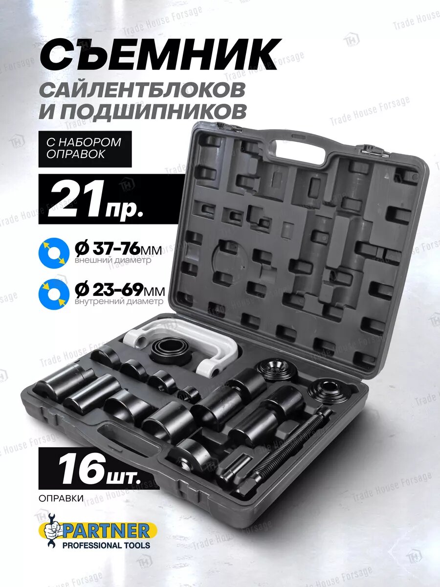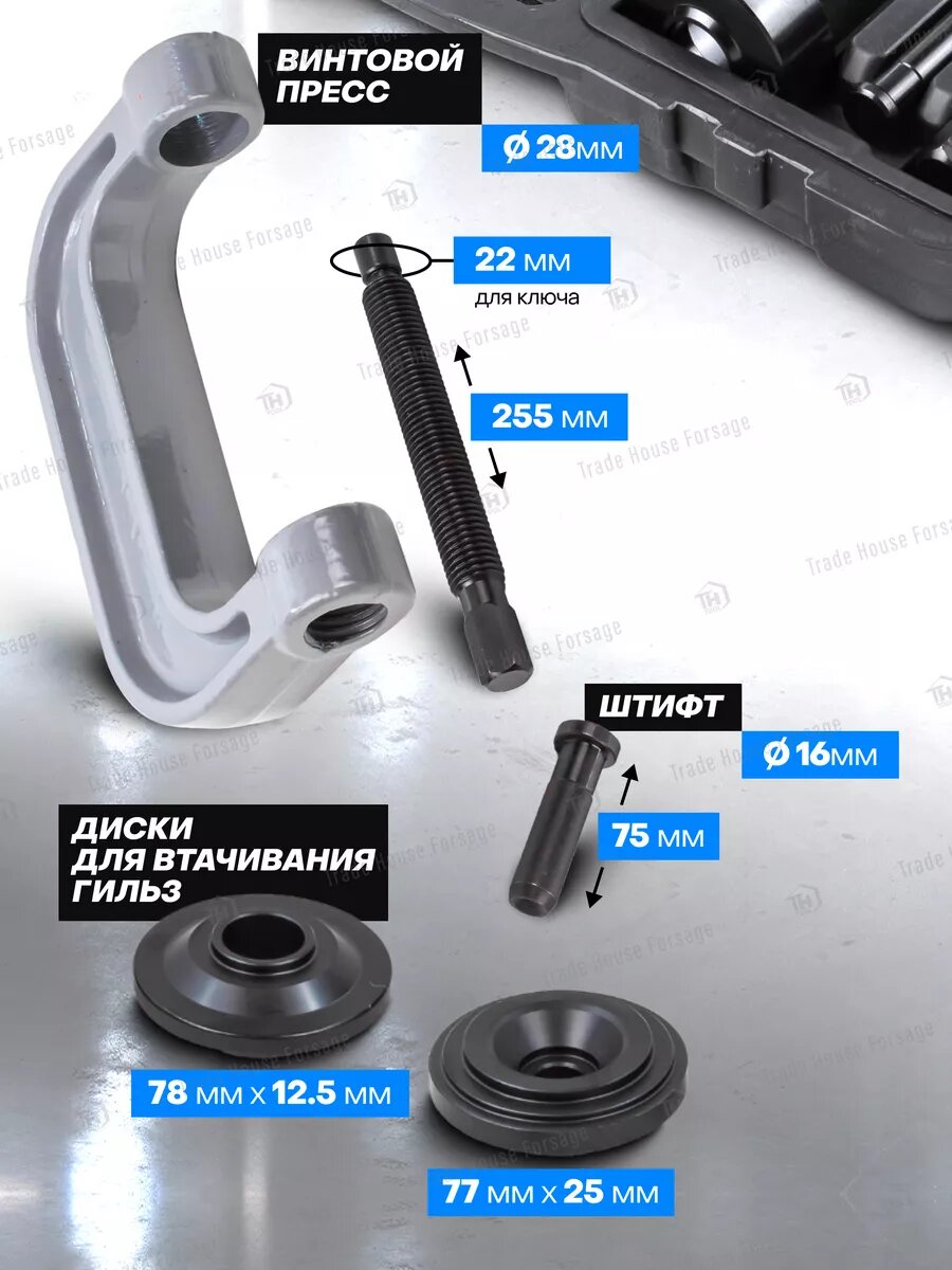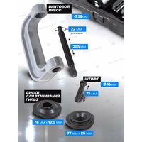 Съемник сайлентблоков и подшипников с набором оправок. Съемник для выдавливания штифтов и втулок подвески без необходимости демонтажа подузла. Устраняет необходимость снимать заднюю или переднюю поперечную балку. В наборе 21 предмет. Для удобного хранения и транспортировки поставляется в прочном пластиковом кейсе ехнические данные: 1 х Винтовой пресс - диаметр винта 28 мм для ключа 22 длина 255 мм; диск для втачивания гильз : 77мм на 25мм; диск для втачивания гильз :78мм на 12,5 мм; Оправки с размерами: Внутренний диаметр 23,0 мм / внешний диаметр 37,0 мм / высота 23,0 мм; Внутренний диаметр 45,0 мм / внешний диаметр 51,0 мм / высота 45,0 мм; Внутренний диаметр 45,0 мм / внешний диаметр 51 мм / высота 94 мм; Внутренний диаметр 46,0 мм / внешний диаметр 50 мм / высота 73,5 мм; Внутренний диаметр 46,0 мм / внешний диаметр 54,0 мм / высота 25,5 мм; Внутренний диаметр 48,5 мм / внешний диаметр 56,5 мм / высота 21,0 мм; Внутренний диаметр 51,0 мм / внешний диаметр 57,0 мм / высота 62 мм; Внутренний диаметр 55,0 мм / внешний диаметр 62,5 мм / высота 91 мм - с вырезом 75,0 мм; Внутренний диаметр 56,5 мм / внешний диаметр 64,5 мм / высота 70 мм; Внутренний диаметр 57,0 мм / внешний диаметр 63,0 мм / высота 20,0 мм; Внутренний диаметр 57,0 мм / внешний диаметр 63,0 мм / высота 45,0 мм; Внутренний диаметр 57,0 мм / внешний диаметр 63,0 мм / высота 60,5 мм; Внутренний диаметр 62,0 мм / внешний диаметр 70,0 мм / высота 58,0 мм; Внутренний диаметр 67,0 мм / внешний диаметр 72,0 мм - высота выточки 30,0 мм / общая высота 85,5 мм; Внутренний диаметр 69,0 мм / внешний диаметр 76,0 мм - высота выточки 31,0 мм / общая высота 58,0 мм; Внутренний диаметр 69,0 мм / внешний диаметр 76,0 мм / высота 55,0 мм; Штифт диаметром 16мм и длиной 75мм.