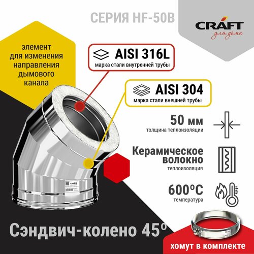 Элемент дымохода сэндвич-колено 45гр Craft HF-50B (316/0,8/304/0,5) Ф130х230: сравнение цен, характеристики, фото, актуальное наличие и цены.