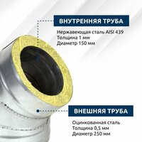 Сэндвич-отвод поворот дымохода на 135 градусов. Сэндвич отвод для сэндвич-трубы представляет собой несколько цилиндрических секций, соединенных сваркой. Благодаря своей конструкции, сэндвич-отвод колено позволяет плавно изменять направление трубопровода без потери давления и скорости потока. Сэндвич отвод для дымохода используется: при необходимости горизонтального смещения оси для обхода препятствия, изменять направление дымовой трубы для преодоления препятствий, возникающих при выводе продуктов горения. Сэндвич-отвод дымохода бренда «UMKPRO» изготавливаются из двух слоёв металла: внутренний слой — нержавеющая сталь AISI 439, наружный слой — оцинкованная сталь. Такая конструкция обеспечивает долговечность и надёжность работы системы дымоудаления. Сталь AISI 439 допускается к использованию до 850 град. Нержавеющая сталь устойчива к коррозии и агрессивным средам, поэтому отвод может использоваться в различных условиях эксплуатации. Сварные швы сэндвич отвода выполнены внахлест, что обеспечивает максимальную прочность. Благодаря качественным материалам и конструкции, отвод не боится резких перепадов температур, нерегулярной топки, высоких температур. Сэндвич-отвод 135° утепленный, в качестве теплоизоляции дымоходной системы используется утеплитель бств-базальтовое супертонкое волокно. Утеплитель помогает предотвратить потерю тепла через дымоход. Внутренняя труба собрана «по конденсату», внешняя «по дыму». Размеры отвода соответствуют стандартам, что облегчает его установку и замену. Отвод легко монтируется благодаря раструбному соединению, для дополнительной фиксации рекомендуется использование хомута и жаропрочного герметика. Дымоходы «UMKPRO» и «ГЕФЕСТ- сталь» полностью совместимы, но не стыкуются с другими производителями!