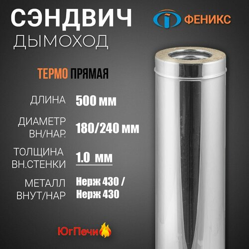 Сэндвич — труба для дымохода 2Т 500. Длина 0,5 м, Диаметр 180/240 мм, Нержавеющая сталь AISI 430, Толщина стенки 1 мм.: сравнение цен, характеристики, фото, актуальное наличие и цены.