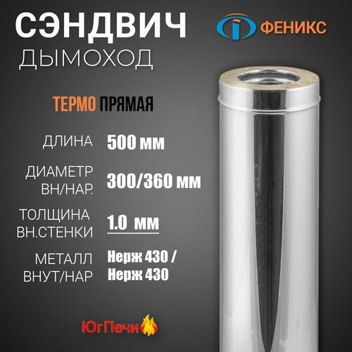 Сэндвич — труба для дымохода 2Т 500. Длина 0,5 м, Диаметр 300/360 мм, Нержавеющая сталь AISI 430, Толщина стенки 1 мм.: сравнение цен, характеристики, фото, актуальное наличие и цены.