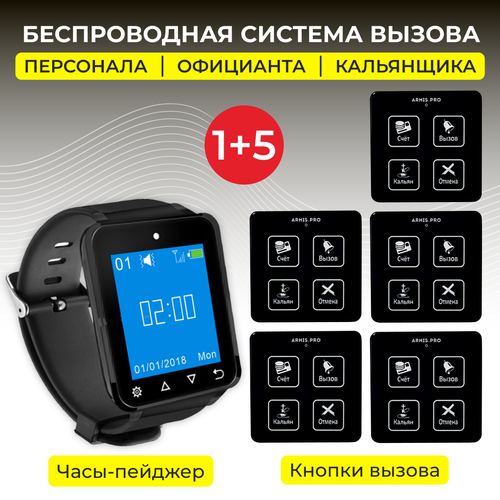Часы официанта и кнопки вызова персонала, официанта и кальянщика для ресторанов и кафе. Комплект системы вызова персонала: пейджер "Элит" - 1 шт, кнопка Квадро "Кальянщик, Счет, Вызов, Отмена" - 5 шт. К данному комплекту можно дополнительно приобрести необходимое количество пейджеров и кнопок вызова персонала и запрограммировать их в состав комплекта.