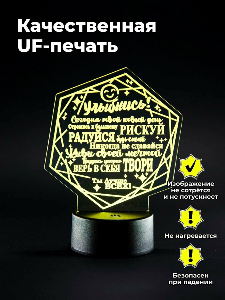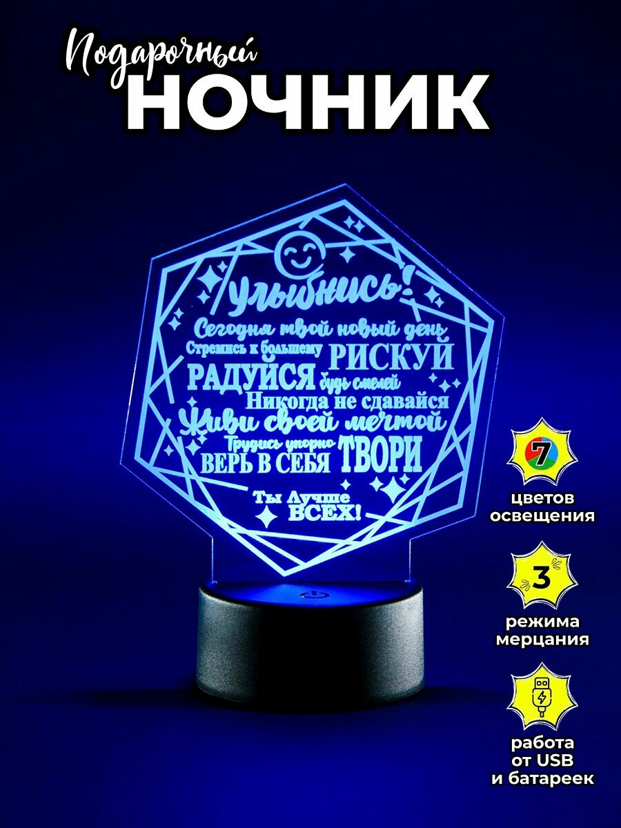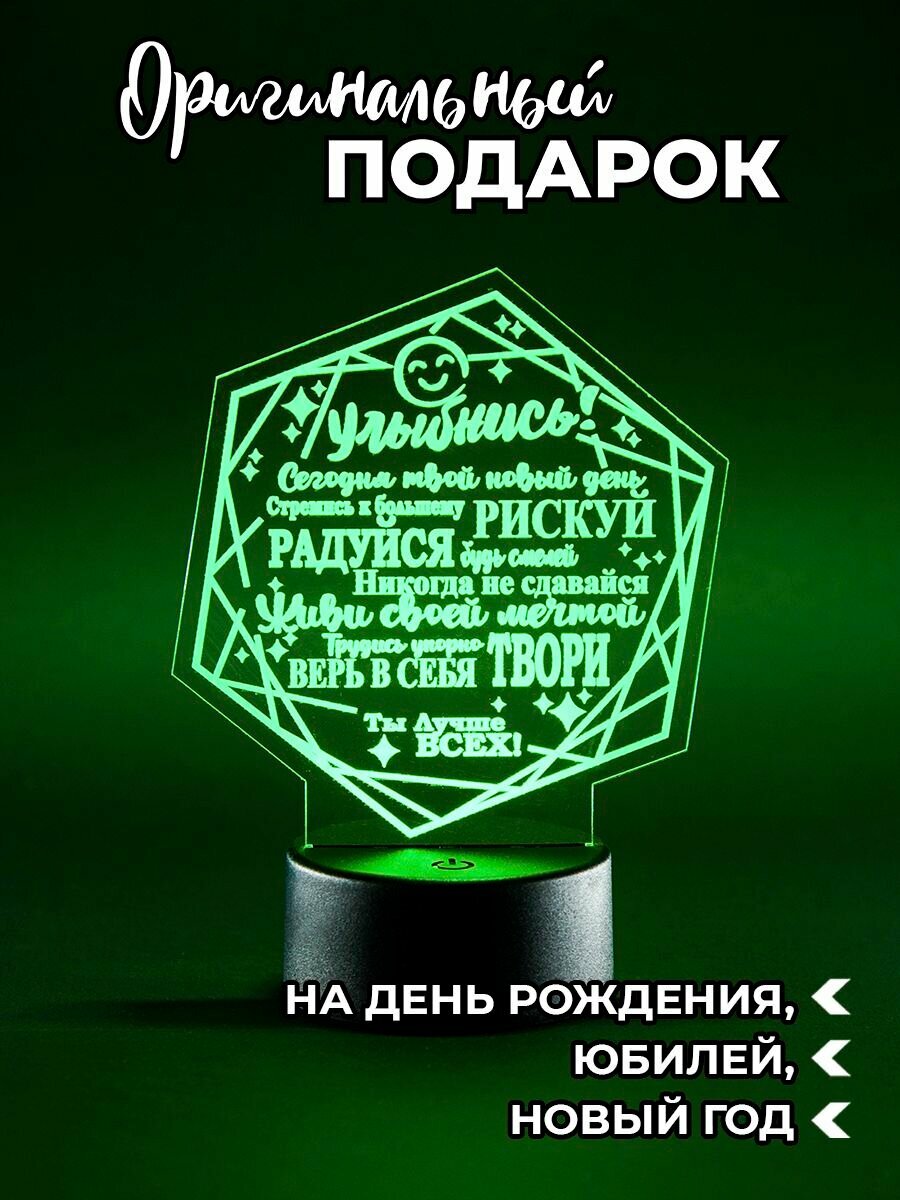 Usb led светильник настольный беспроводной на батарейках необычной формы с проникновенными словами и надписью «Улыбнись» вызовет радостные и позитивные эмоции. Данный прикроватный акриловый светильник – оригинальный, стильный, душевный подарок!