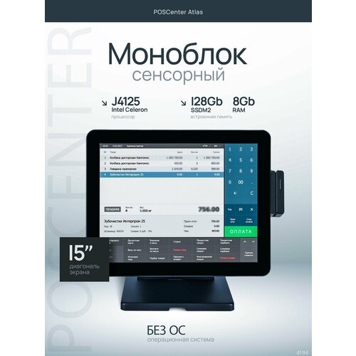 Мощный сенсорный POS моноблок POSCenter Atlas с отличной эргономикой. Терминал имеет следующие характеристики 15", PCAP, J4125, DDR4 SODIMM 8Gb 2400MHz, M2 SATA 2280 SSD 128GB, MSR. Поставляется без ОС.
