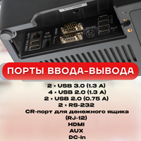 2xUSB, 6xUSB, Audio, Bluetooth, DC-in, Ethernet, HDMI, Line-OUT, RJ-12, RS-232, Wi-Fi