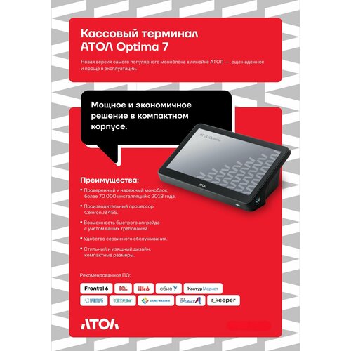 Надежный и высокопроизводительный POS-терминал АТОЛ Optima с новым производительным и современным процессором Intel Celeron J3455 поможет автоматизировать торговлю в соответствии с 54-ФЗ. В АТОЛ Optima учтены все требования к современному кассовому оборудованию: высокое качество, красивый дизайн, компактность, работа со всем торговым оборудованием и программами, возможность автономной работы от аккумулятора, установки дополнительного накопителя HDD/SSD и многое другое.