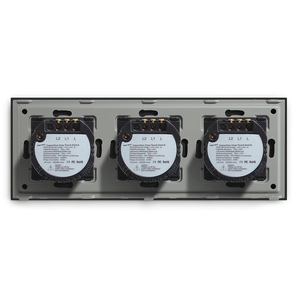 - Выключатель сенсорный шесть клавиш, три поста, представляет собой три двойных сенсорных выключателя объединенных одной стеклянной панелью, предназначен для управления шестью линиями нагрузки, для включения и выключения света вместо нажатия на механическую клавишу производится прикосновение к сенсорной зоне выключателя.
