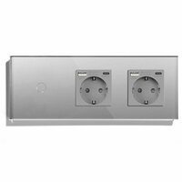 - Сенсорный выключатель с двумя розетками евростандарта предназначен для управления одной линией освещения и подключение нагрузки к двум розетке до 3500 ватт на каждую. Представляет собой сенсорный выключатель с двумя USB розетками объединенные под одной стеклянной панелью. Для включения и выключения света вместо нажатия на механическую клавишу производится прикосновение к сенсорной зоне выключателя.