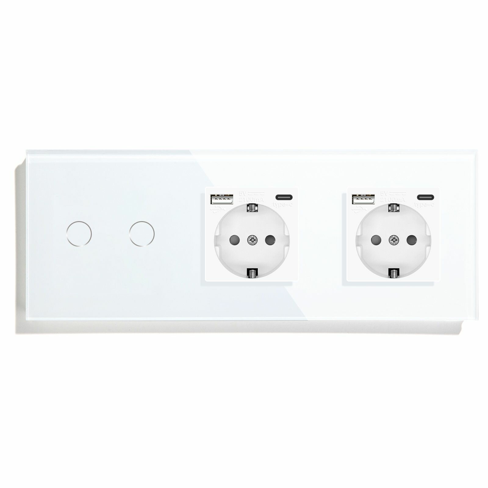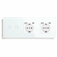 - Сенсорный выключатель с двумя розетками евростандарта предназначен для управления двумя линиями освещения и подключение нагрузки к двум розетке до 3500 ватт на каждую. Представляет собой сенсорный выключатель с двумя USB розетками объединенные под одной стеклянной панелью. Для включения и выключения света вместо нажатия на механическую клавишу производится прикосновение к сенсорной зоне выключателя.