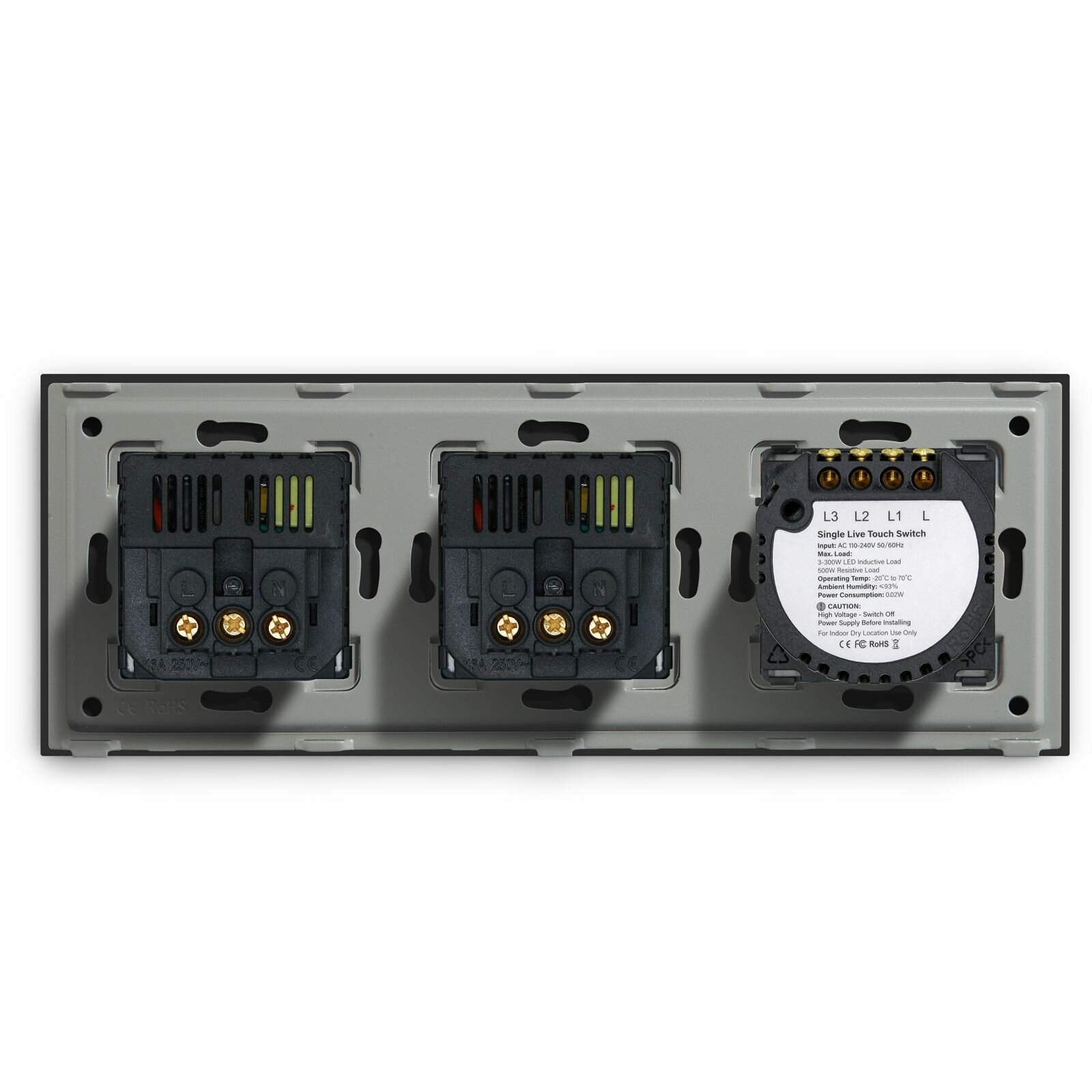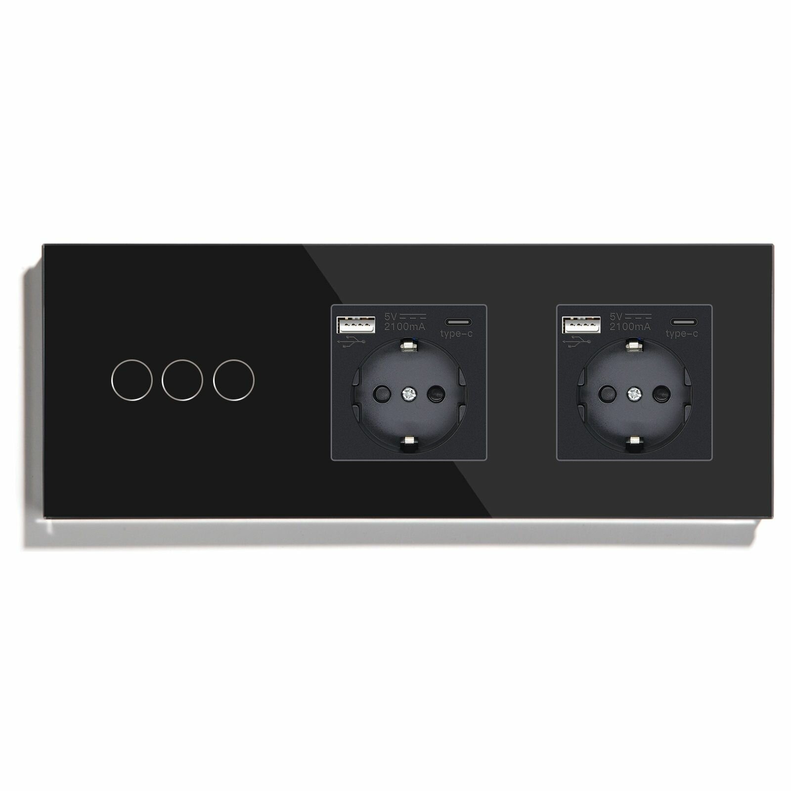 - Сенсорный выключатель с двумя розетками евростандарта предназначен для управления тремя линиями освещения и подключение нагрузки к двум розетке до 3500 ватт на каждую. Представляет собой сенсорный выключатель с двумя USB розетками объединенные под одной стеклянной панелью. Для включения и выключения света вместо нажатия на механическую клавишу производится прикосновение к сенсорной зоне выключателя.