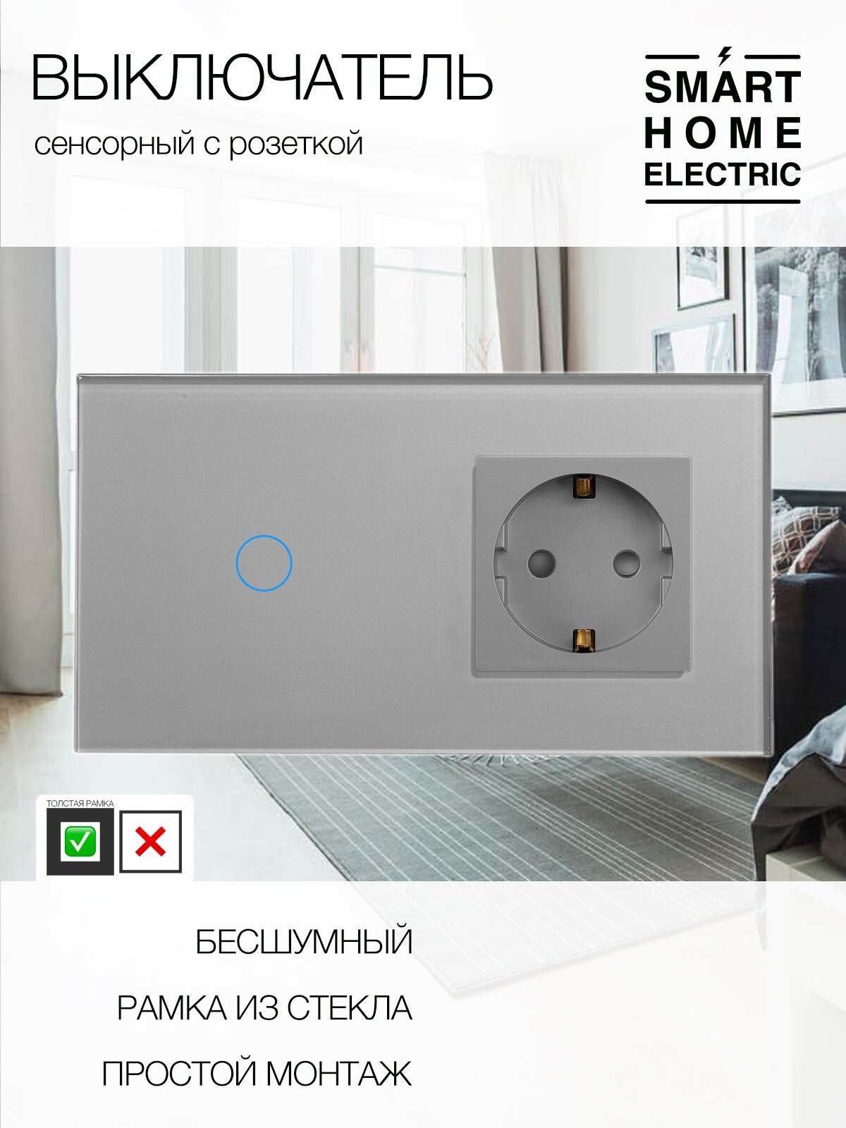 Одноклавишный сенсорный выключатель с розеткой в стеклянной рамке серого цвета. Это готовый комплект для установки, докупать ничего не нужно. Устанавливается в двойной стандартный круглый подрозетник, подключение выключателя без нуля (только фазный провод и на лампу). – Рамка из натурального стекла 157 на 86 мм. Выпирает от стены всего на 10 мм. Выглядит стильно, легко вписывается в любой интерьер. – Блок электрической розетки с заземлением. Универсальная розетка на 16А. Оснащена защитными шторками от засовывания посторонних предметов детьми. – Блок сенсорного выключателя . Управление светильником в режиме (ВКЛ/выкл). Удобная ненавязчивая голубая подсветка при выключенном свете, и более заметная при включенном. Полностью бесшумное включение / выключение. Чувствительный сенсор с быстрым срабатыванием. Максимальная нагрузка на блок 300 Вт. Все остальные розетки и выключатели есть в наличии в нашем магазине