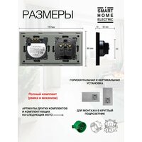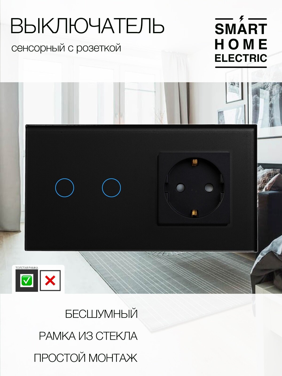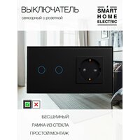 Двухклавишный сенсорный выключатель с розеткой в стеклянной рамке черного цвета. Это готовый комплект для установки, докупать ничего не нужно. Устанавливается в двойной стандартный круглый подрозетник, подключение выключателя без нуля (только фазный провод и на лампу). – Рамка из натурального стекла 157 на 86 мм. Выпирает от стены всего на 10 мм. Выглядит стильно, легко вписывается в любой интерьер. – Блок электрической розетки с заземлением. Универсальная розетка на 16А. Оснащена защитными шторками от засовывания посторонних предметов детьми. – Блок сенсорного выключателя . Управление светильником в режиме (ВКЛ/выкл). Удобная ненавязчивая голубая подсветка при выключенном свете, и более заметная при включенном. Полностью бесшумное включение / выключение. Чувствительный сенсор с быстрым срабатыванием. Максимальная нагрузка на блок 300 Вт. Все остальные розетки и выключатели есть в наличии в нашем магазине