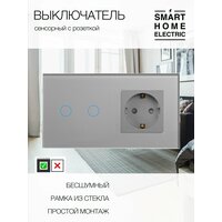 Двухклавишный сенсорный выключатель с розеткой в стеклянной рамке серого цвета. Это готовый комплект для установки, докупать ничего не нужно. Устанавливается в двойной стандартный круглый подрозетник, подключение выключателя без нуля (только фазный провод и на лампу). – Рамка из натурального стекла 157 на 86 мм. Выпирает от стены всего на 10 мм. Выглядит стильно, легко вписывается в любой интерьер. – Блок электрической розетки с заземлением. Универсальная розетка на 16А. Оснащена защитными шторками от засовывания посторонних предметов детьми. – Блок сенсорного выключателя . Управление светильником в режиме (ВКЛ/выкл). Удобная ненавязчивая голубая подсветка при выключенном свете, и более заметная при включенном. Полностью бесшумное включение / выключение. Чувствительный сенсор с быстрым срабатыванием. Максимальная нагрузка на блок 300 Вт. Все остальные розетки и выключатели есть в наличии в нашем магазине