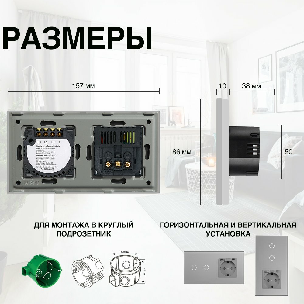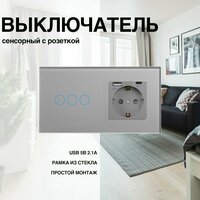 Сенсорный выключатель с розеткой, рамка из стекла, 2 поста (3кл.+1роз.): сравнение цен, характеристики, фото, актуальное наличие и цены.