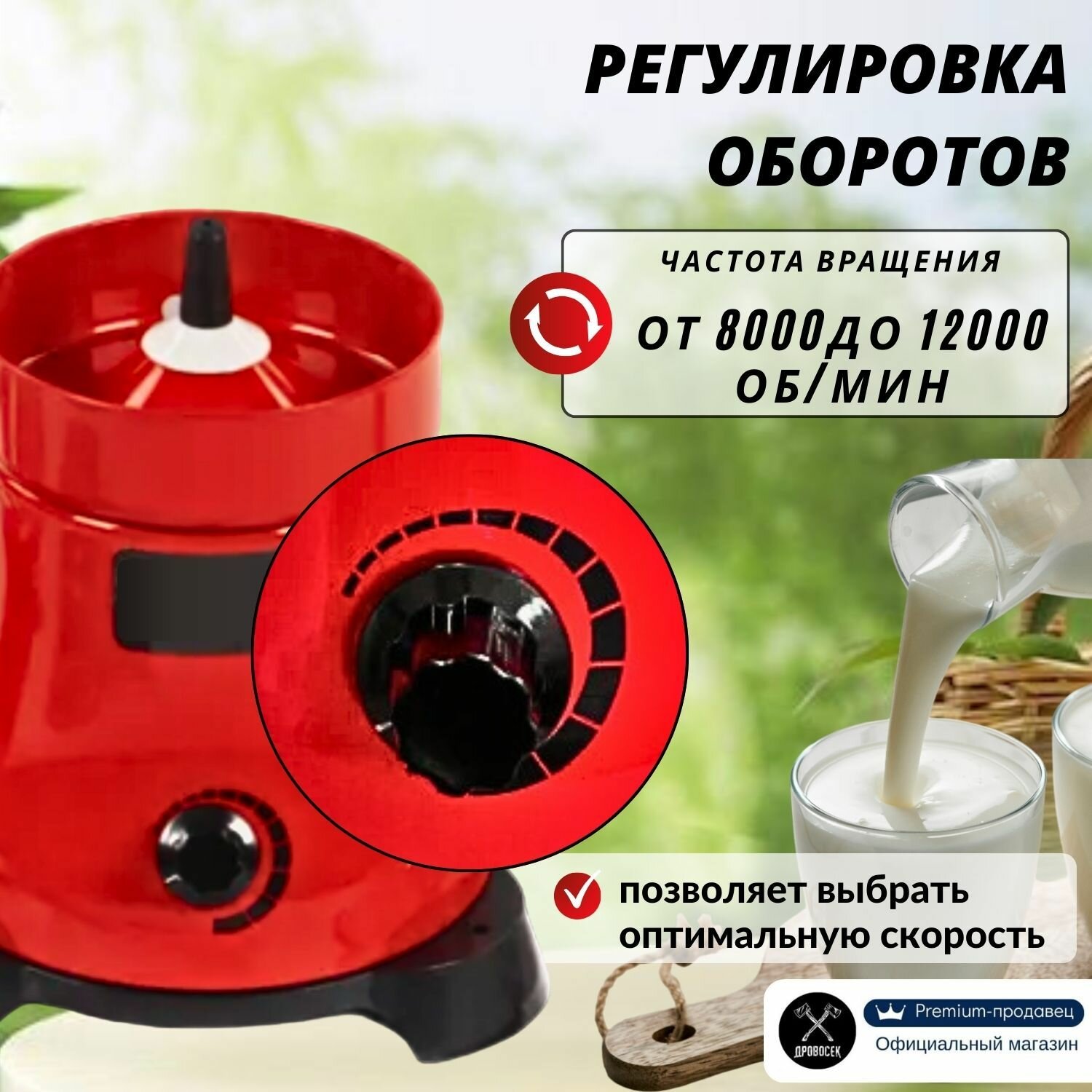 Один из ключевых параметров этой модели – регулировка оборотов, что позволяет настраивать скорость вращения чаши молокоприемника в зависимости от необходимого результата. Частота вращения - от 8000 до 12000 оборотов в минуту.