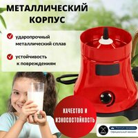 Корпус сливкоотделителя выполнен из ударопрочного металлического сплава и обеспечивает надежность и прочность оборудования. Такой корпус защищает внутренние механизмы от повреждений, так как он устойчив к повреждениям, и обеспечивает таким образом долгий срок службы сепаратора. Кроме того, металлический корпус ручного сепаратора легко моется и обеспечивает гигиеничность процесса разделения молока.