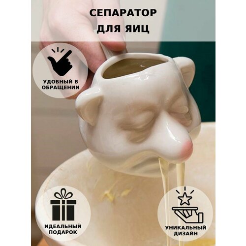 Сепаратор для яиц пригодится всем, кто любит печь пироги, бисквиты для детей и взрослых, а также баловать близких воздушными десертами. Если вы сталкивались с трудностью отделения белка яйца от желтка при приготовлении блюд, то это незатейливое приспособление для кухни станет настоящей находкой. Отделитель желтка от белка сможет аккуратно и быстро справится с поставленной задачей. Вам просто нужно разбить яйцо в область сепаратора, наклонить сепаратор, в центре удержится желток, а белок вытечет через отверстия. Инструмент кондитера изготовлен из материала керамика. Керамическая посуда имеет форму головы мужчины с длинным носом и выглядит как кружка с ручкой кольцо. Данная кухонная утварь имеет уникальный дизайн и может использоваться как керамические фигурки, статуэтки для интерьера. После использования, промойте сепаратор в проточной воде, можно использовать жидкие моющие средства. Допускается, если будет использоваться посудомоечная машина. Приобретая сепаратор для яиц, у вас на кухне появляется удобный и практичный аксессуар, который будет помогать вам в приготовлении ваших любимых блюд. Эта фигурка поднимет настроение и как милый декор, украсит вашу кухню!
