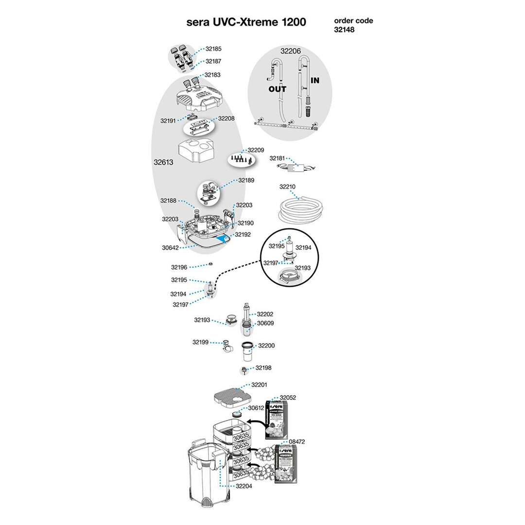 | Подробная комплектация | Корпус фильтра, головка фильтра, 4 емкости для фильтрующих материалов, 1 губка, 12 штук Sera Crystal Clear Professional, 2000 мл Sera Siporax Professional, 1 коробка с оснасткой, 2 шланга по 150 см, инструкция по применению. Картонная упаковка. |