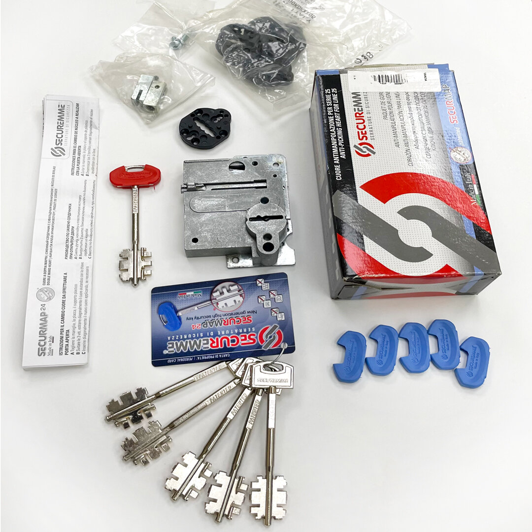 Сувальдный сердечник (нуклео) Securemme Securmap 25SXSZBS57 (левый) подходит для замков Securemme 25 серии левого исполнения двери. В комплект входит основной ключ (головка будет синего цвета, таких ключей в комплекте 5) и монтажный ключ (головка красного цвета, в комплекте 1 ключ). Монтажный ключ закрывает замок на 2 оборота. Основные ключи на 4 оборота. Если основным ключом закрывать замок на 2 оборота, то монтажный ключ будет активным, после того как основными ключами замок будет закрыт на 4 оборота, монтажный ключ будет заблокирован и больше не будет работать.