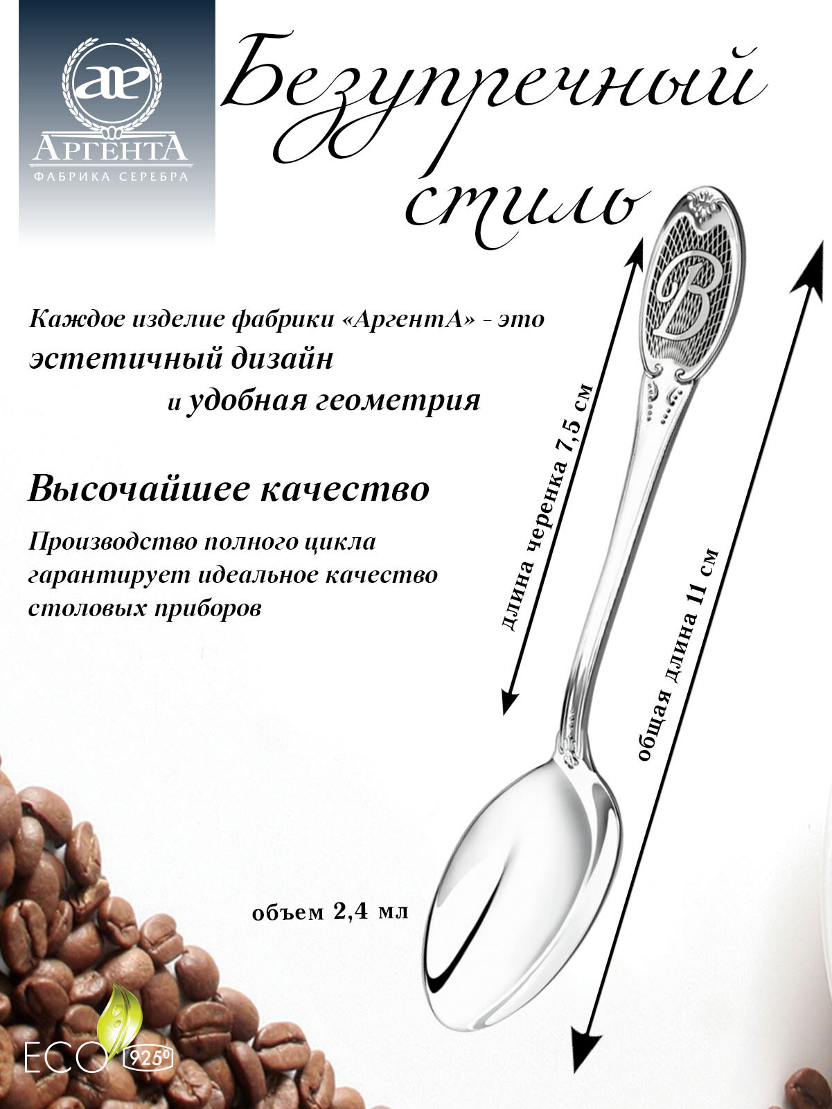 Серебряная ложка кофейная «Гладкая» с буквой В с чернением от бренда Аргента: сравнение цен, характеристики, фото, актуальное наличие и цены.