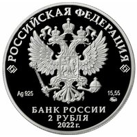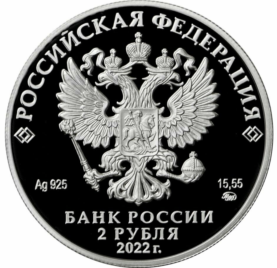 На аверсе изображен Государственного герба Российской Федерации, над ним вдоль канта – надпись полукругом: " российская федерация", обрамленная с обеих сторон сдвоенными ромбами, внизу под гербом: слева – обозначения драгоценного металла и пробы сплава, справа – содержание химически чистого металла и товарный знак монетного двора, внизу в центре в три строки – надпись: " банк россии", номинал монеты: "2 рубля", год выпуска: "2022 г."