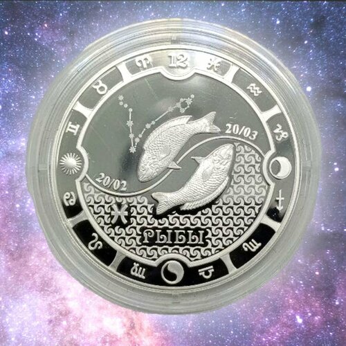 Реверс: На зеркальном поле вдоль канта расположены 12 зодиакальных символов, цифра знака и символы солнца, луны и Инь и Янь. Центральная часть изображения представляет собой так же символ Инь и Янь. Верхняя часть его имеет зеркальное поле, в котором расположен зодиакальный символ знака Рыбы, схематичное изображение созвездия Рыб и даты, в которые господствует этот знак зодиака. В нижней части на зеркальном поле расположено схематичное повторяющееся изображение символа стихии знака, надпись знака зодиака и его стилизованное изображение.