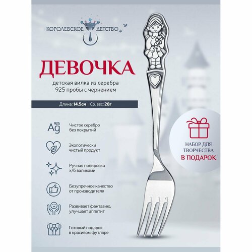 Вилка детская серебряная "Девочка" с чернением поставляется в подарочной упаковке, что делает ее отличным вариантом для подарка на рождение ребенка, день рождения, крестины или первый зубик.