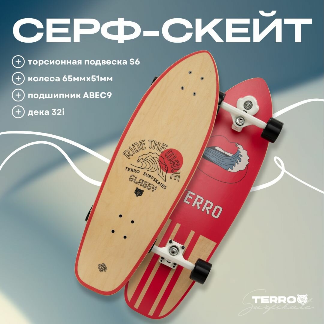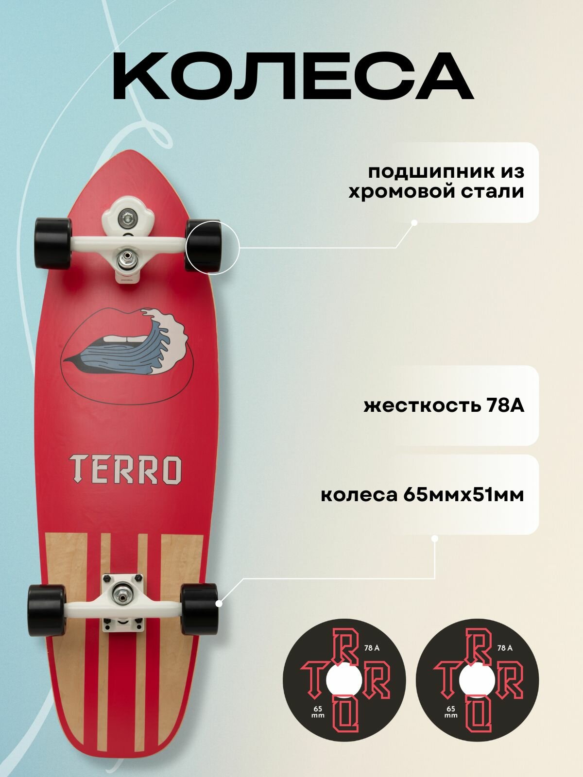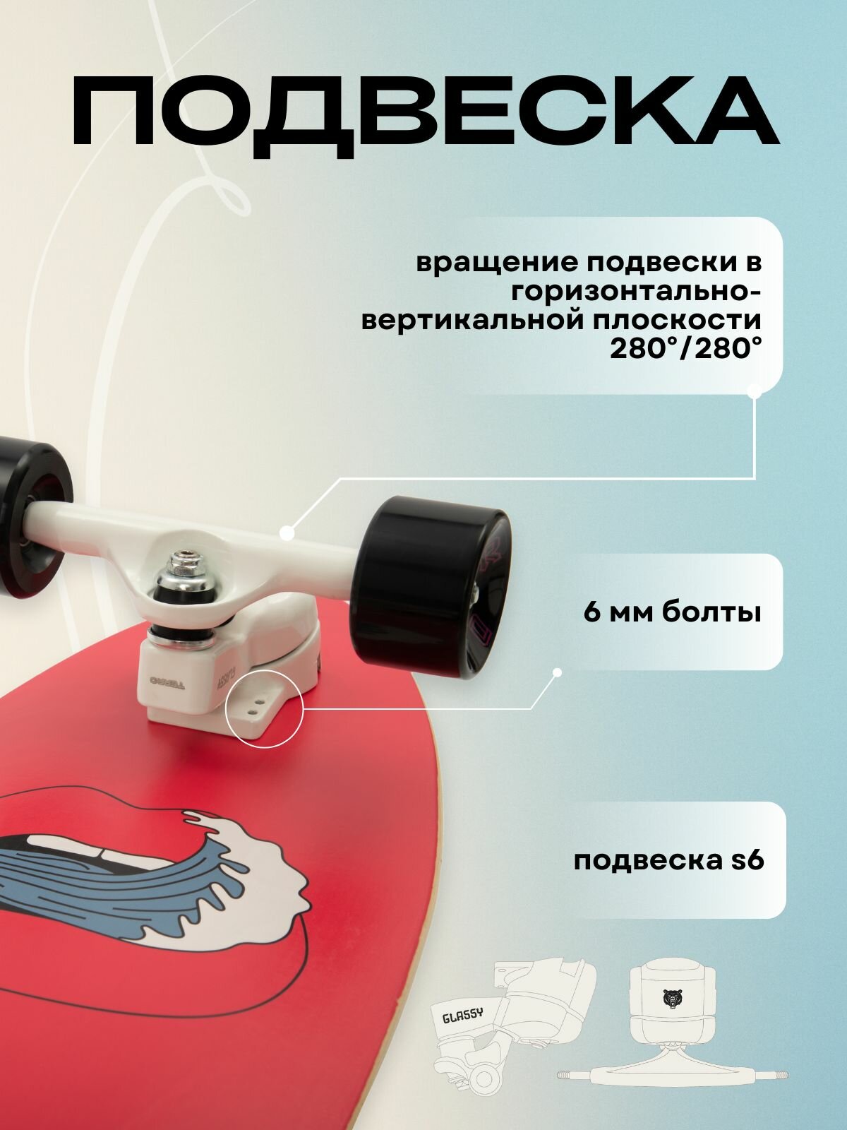 Сёрфскейт предлагает совершенно иной способ катания по сравнению с традиционными лонгбордами. Движения на сёрфскейте очень похожи на сёрфинг, где райдер набирает скорость за счёт работы плечевого пояса и переноса центра тяжести от носка к пятке – пампинга. Эта техника сильно отличается от лонгборда и скейтборда, где для набора скорости нужно отталкиваться ногой от поверхности. Подвески сёрфскейта очень маневренные, позволяют совершать резкие повороты в любую сторону. Размер деки (7 слоев клена) 32" на 9,5 дюймов (82*24 см). Полиуретановые колеса размером 65 на 51 мм, жесткость - 78А, подшипники - ABEC-9. Прочные алюминиевые подвеска шириной 6,25" S6 (вращениее на 280/280 градусов) обеспечат надежное катание. Для любителей лонгборда, сап бордов, серфинга, скейтбординга и других активных видов спорта.