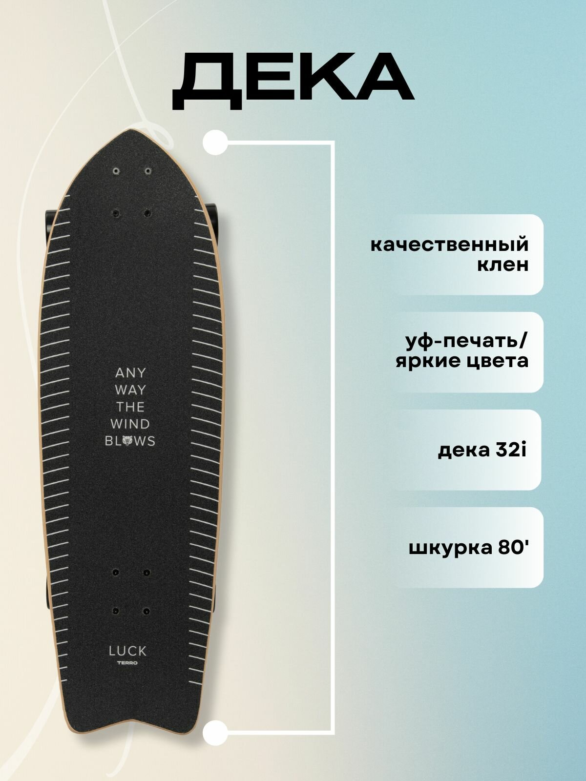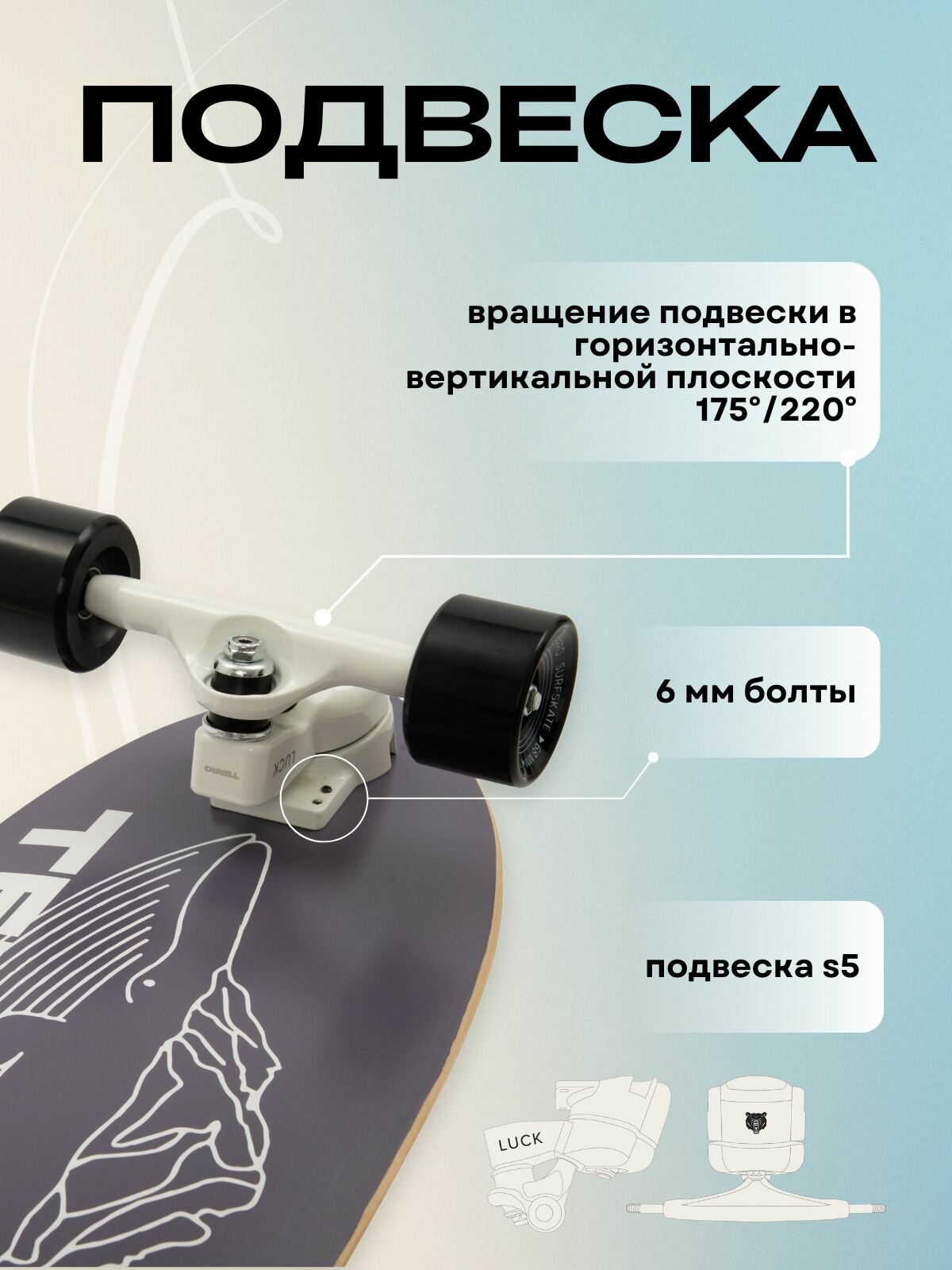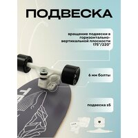 Сёрфскейт предлагает совершенно иной способ катания по сравнению с традиционными лонгбордами. Движения на сёрфскейте очень похожи на сёрфинг, где райдер набирает скорость за счёт работы плечевого пояса и переноса центра тяжести от носка к пятке – пампинга. Эта техника сильно отличается от лонгборда и скейтборда, где для набора скорости нужно отталкиваться ногой от поверхности. Подвески сёрфскейта очень маневренные, позволяют совершать резкие повороты в любую сторону. Размер деки (7 слоев клена) 32" на 9,5 дюймов (82*24 см). Полиуретановые колеса размером 65 на 45 мм, жесткость - 78А, подшипники - ABEC-9. Прочные алюминиевые подвеска шириной 6,25" S5 (вращениее на 175/220 градусов) обеспечат надежное катание. Для любителей лонгборда, сап бордов, серфинга, скейтбординга и других активных видов спорта.