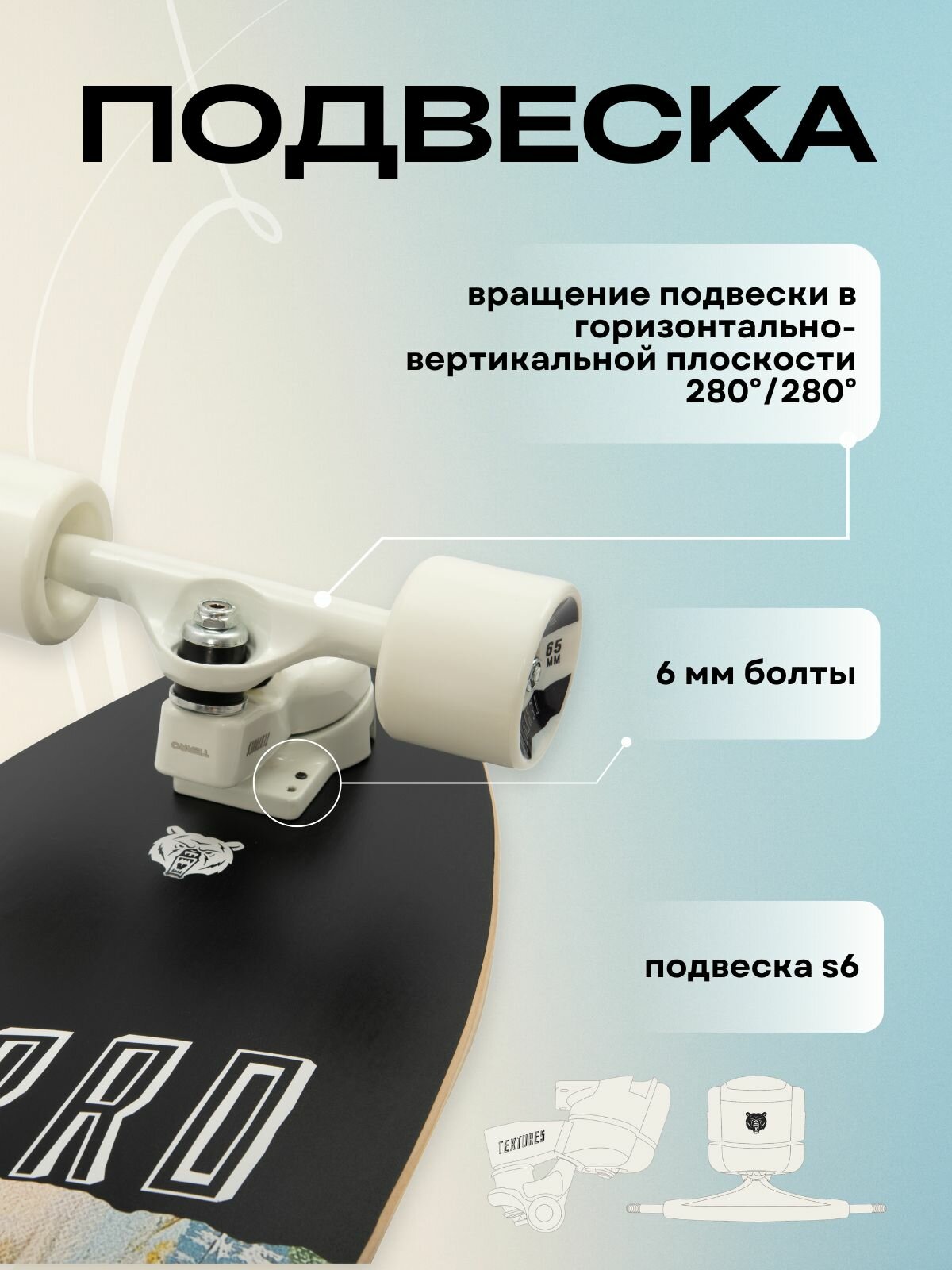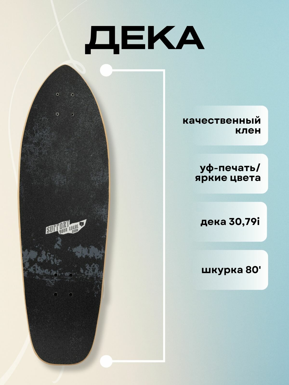 Сёрфскейт предлагает совершенно иной способ катания по сравнению с традиционными лонгбордами. Движения на сёрфскейте очень похожи на сёрфинг, где райдер набирает скорость за счёт работы плечевого пояса и переноса центра тяжести от носка к пятке – пампинга. Эта техника сильно отличается от лонгборда и скейтборда, где для набора скорости нужно отталкиваться ногой от поверхности. Подвески сёрфскейта очень маневренные, позволяют совершать резкие повороты в любую сторону. Размер деки (7 слоев клена) 32" на 9,5 дюймов (82*24 см). Полиуретановые колеса размером 65 на 51 мм, жесткость - 78А, подшипники - ABEC-9. Прочные алюминиевые подвеска шириной 6,25" S6 (вращениее на 280/280 градусов) обеспечат надежное катание. Для любителей лонгборда, сап бордов, серфинга, скейтбординга и других активных видов спорта.