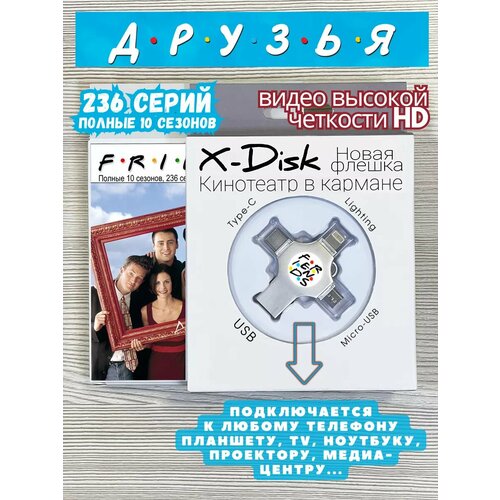 Шестеро друзей – Рейчел, Моника, Фиби, Джоуи, Чендлер и Росс – живут по соседству, вместе убивают время, делятся секретами и иногда очень сильно влюбляются. За 10 лет показа сериал собрал гигантскую аудиторию преданных поклонников, кучу номинаций и зрительскую любовь во всем мире. Вместе с шестеркой главных героев мы смеялись, переживали и учились относиться к жизни проще. А сколько знаменитостей за эти годы побывали на съемочной площадке, сколько сувениров было выпущено – всего и не перечислить! Этот замечательный сериал записан в HD-качестве видео на новой, универсальной флешке "X-Disk", которая благодаря своей форме имеет 4 разных разъёма: