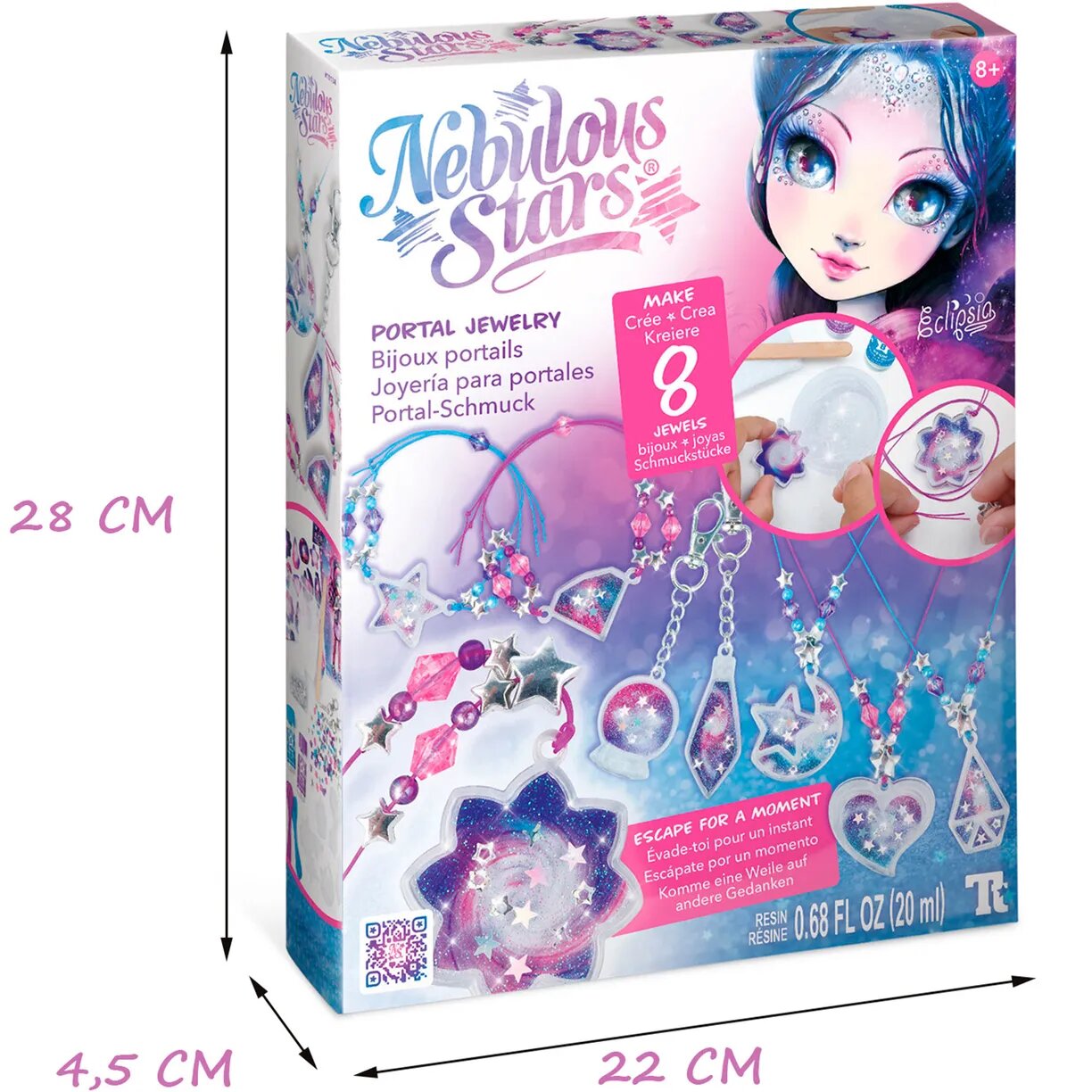 Набор для творчества по созданию украшений для девочек. Изготовление драгоценных камней с помощью специальной смолы, блёсток и наклеек, используя 8 формочек для заполнения. Создание подвесок, браслетов и брелоков с помощью нейлоновых нитей, бусин, крючков и колечек. К набору прилагается подробная инструкция и буклет с историей звёздочки Eclipsia.Набор предназначен для детей старше 7 лет.Комплектация: 8 форм для драгоценных камней, 2 бутылочки со смолой, страница с наклейками, блёстки и блестящая пудра, нейлоновые шнуры, 105 бусин, 2 крючка, 2 кольца, контейнер для смешивания и палочка, одноразовые перчатки, полная история звёздочки Eclipsia, инструкция.Nebulous Stars — бренд игрушек и детских принадлежностей и наборов для творчества. Оригинальная творческая концепция бренда легла в основу создания серий, объединенных идеей волшебного мира. Бренд выпускает тематических персонажей-кукол, комплекты для создания детских аксессуаров, для плетения, вышивки и лепки, планшеты для рисования. Это необычные подарки, в каждом из которых есть своя история. Бренд заботится о всестороннем развитии ребенка, о том, чтобы превратить обучение в сказку и наполнить каждый день удивительными приключениями и необычными крафтовыми поделками.Размер индивидуальной упаковки: 22,2 х 27,9 х 4,5 см