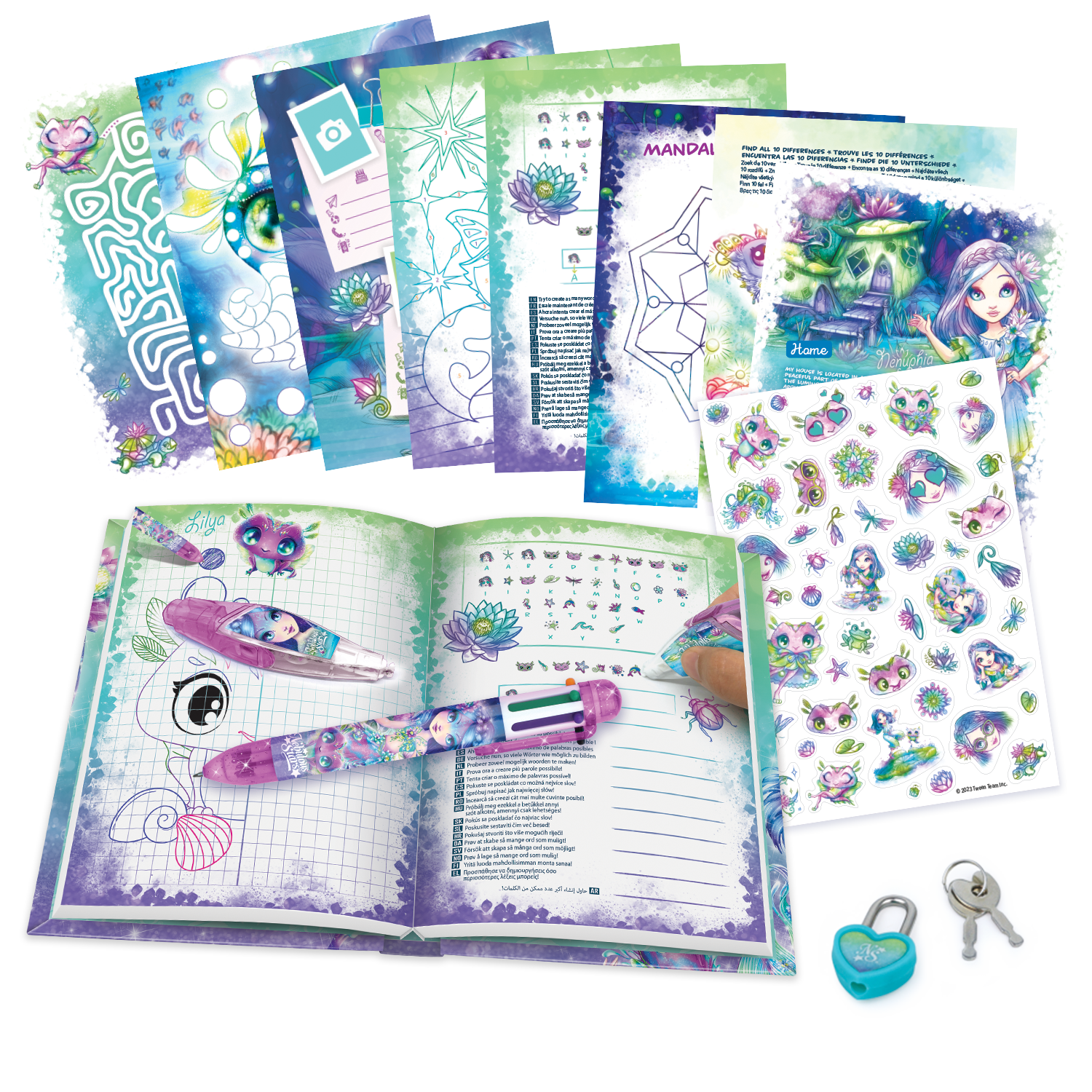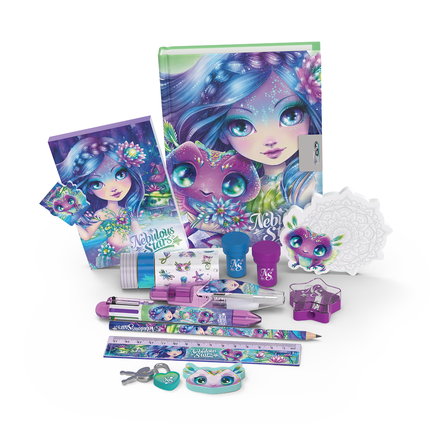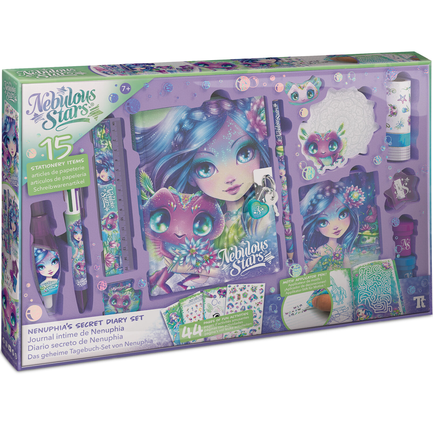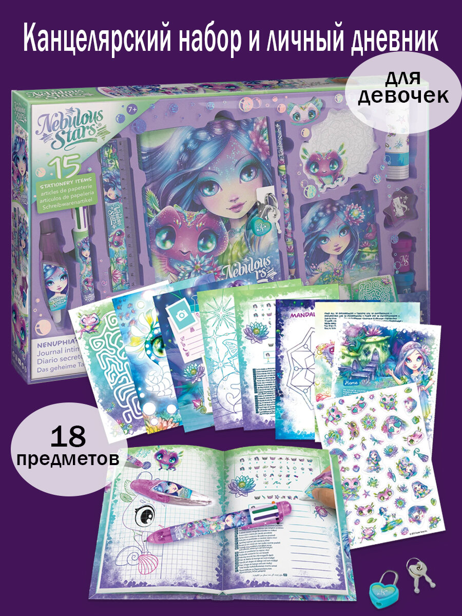 Комплектация: 6-цветная шариковая ручка, ручка-аппликатор с рисунком, блокнот для творчества и раскрашивания, коллекционный ластик, точилка для карандашей, линейка, магнитная закладка, рулон наклеек, карандаш, 2 скрепки для бумаги, 40 стикеров для заметок, 3 рулона клейкой ленты, 2 самоклеящиеся марки; личный дневник (200 стр.) включает: история звёздочки Nenuphia, 44 страницы интересных заданий, страница с наклейками, 150 разлинованных страниц.
