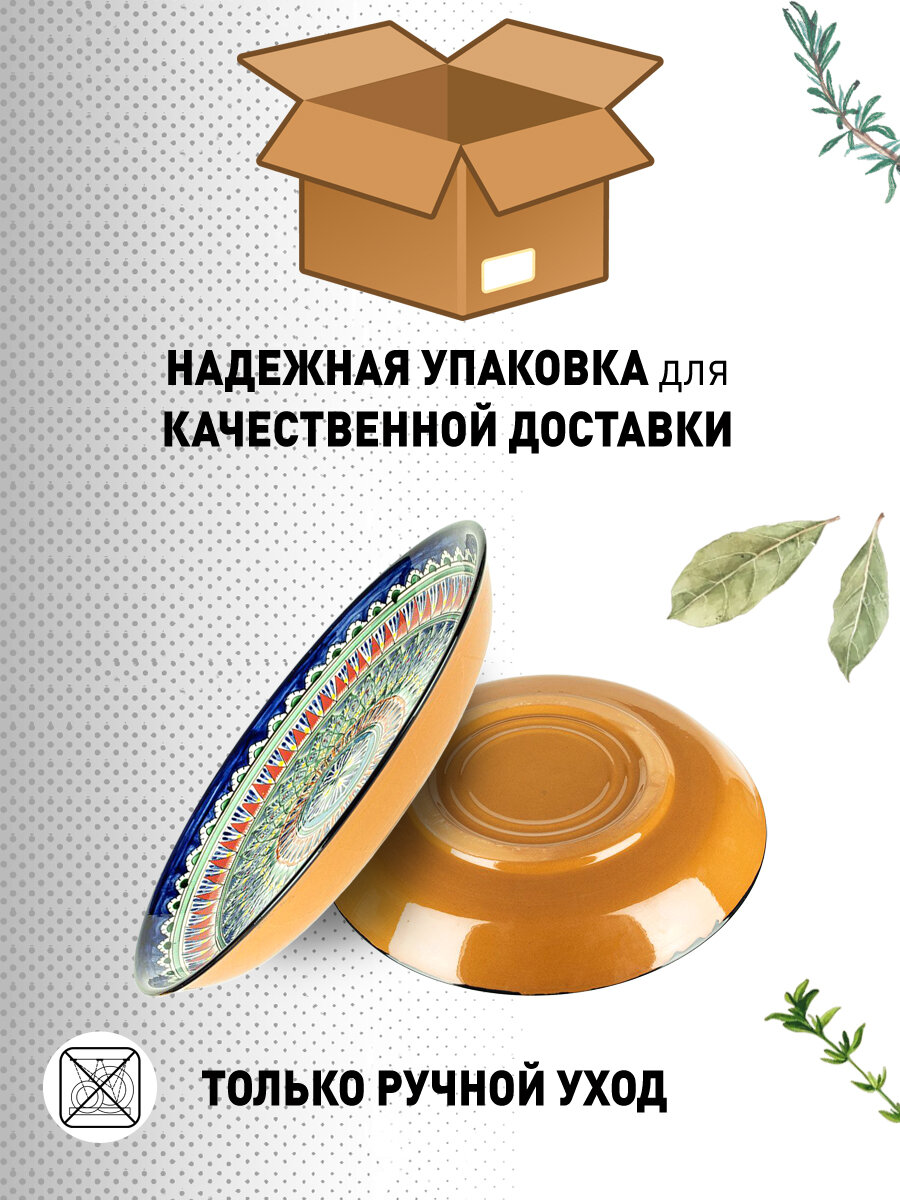 Добро пожаловать в мир изысканности и традиции с нашим уникальным узбекским ляганом из керамики, вдохновленным великолепными ремесленными традициями Риштана. Ляган 32 см ручной работы не только украсит ваш стол, но и придаст вашему обеду аутентичность и неповторимость. Каждый ляган узбекский из риштанской керамики с уникальным рисунком – это произведение искусства, созданное с любовью и вниманием к деталям. Ляган риштанская керамика для плова не только сохраняет традиции риштанского ремесла, но и передает вам его красоту и энергию. Используйте тарелка ляган узбекский как стильный элемент декора интерьера на стену или как праздничное обеденное блюдо для плова или шашлыка даже на свадьбу – в любом случае, вы останетесь в восторге от его красоты и функциональности. Блюдо ляган риштанская керамика идеальный выбор для тех, кто ценит уникальность и качество. Красивое сервировочное блюдо для нарезки или фруктов станет не только незаменимым украшением для дома на вашей кухне или столовой, но и прекрасным подарком мужчине или женщине на память без повода. Изготовленная мастерами, ценящими тысячелетние техники, керамическая декоративная тарелка из глины превосходит весь ожидаемый стандарт качества. Узбекский ляган 32 см выполнен из высококачественной керамики, сотканной с душой и вдохновением. Независимо от того, готовите вы блюда традиционной восточной кухни или желаете привнести нотку экзотики в вашу повседневную жизнь, большое узбекское блюдо для подачи из риштанской керамики станет незаменимым помощником. Его удобная глубокая форма и объем позволят подать блюда стильно и с изыском, подчеркнув атмосферу восточной гостеприимности. Ощутите гармонию приготовления и подачи блюд с ляганом для плова, который не только добавит в ваш дом нотки красоты и стиля, но и станет настоящим произведением искусства. Не упустите возможность восхитить себя и своих близких уникальным приобретением из Узбекистана, которое будет радовать вас годами.