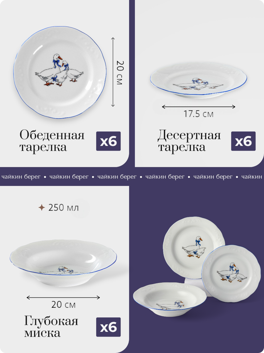 Купить Сервиз обеденный на 6 персон, 18 предметов «Гуси», фарфоровый набор посуды столовой с доставкой по всей России. Сервиз обеденный на 6 персон, 18 предметов «Гуси», фарфоровый набор посуды столовой: сравнение цен, характеристики, фото, актуальное наличие и цены.