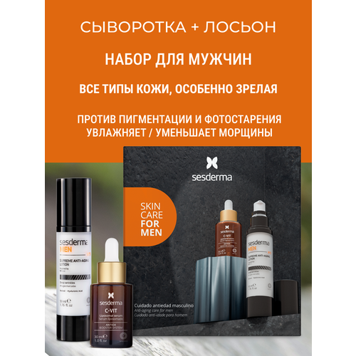 Антивозрастной мужской лосьон MEN Supreme разработан специально для мужской кожи. SESDERMA MEN Supreme anti-aging lotion - мужской антивозрастной лосьон на основе гиалуроновой кислоты, Системы 3-Retinol в липосомированной форме с цинком, ресвератрола и Витамина С борется против признаков усталости, сокращает количество морщин и пятен на зрелой коже. Создает повышенную эффективность благодаря нанотехнологиям. Суперлегкая текстура + антивозрастная сила больше, чем у кремов более насыщенных.