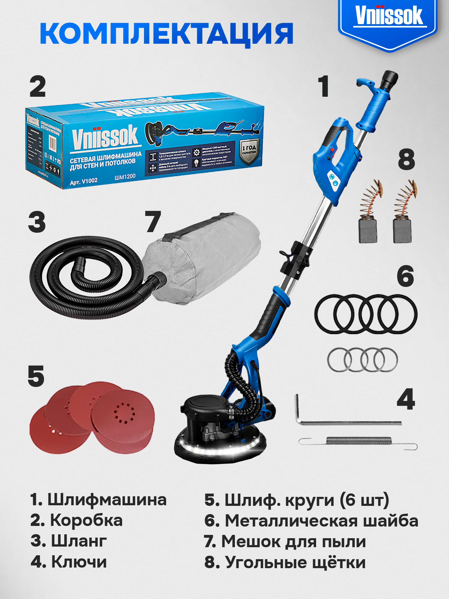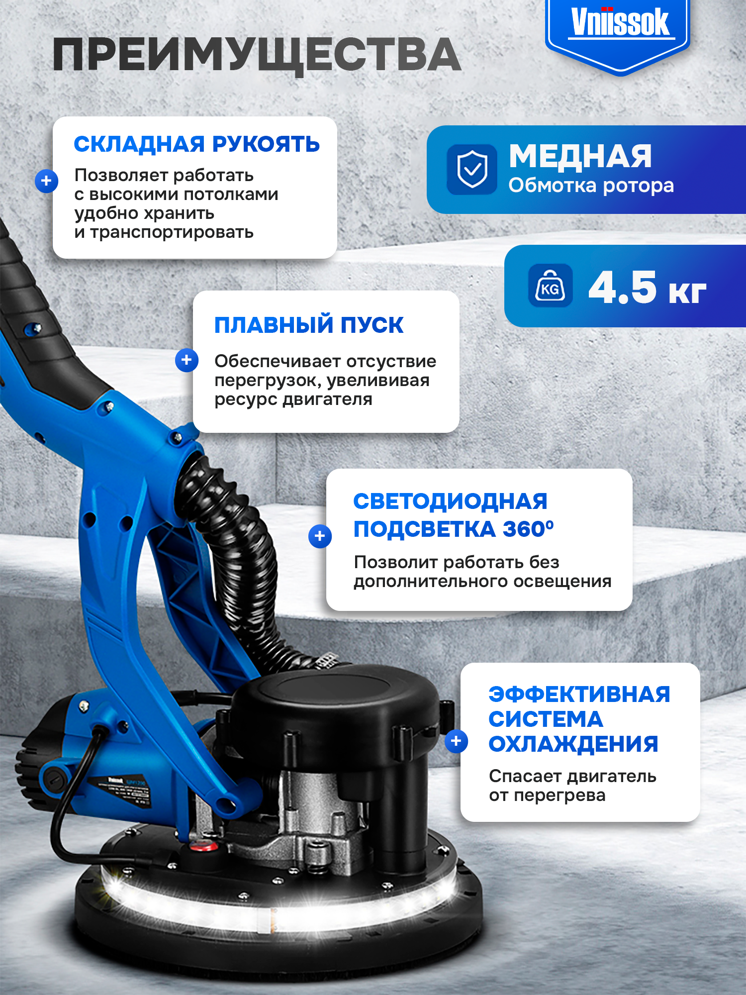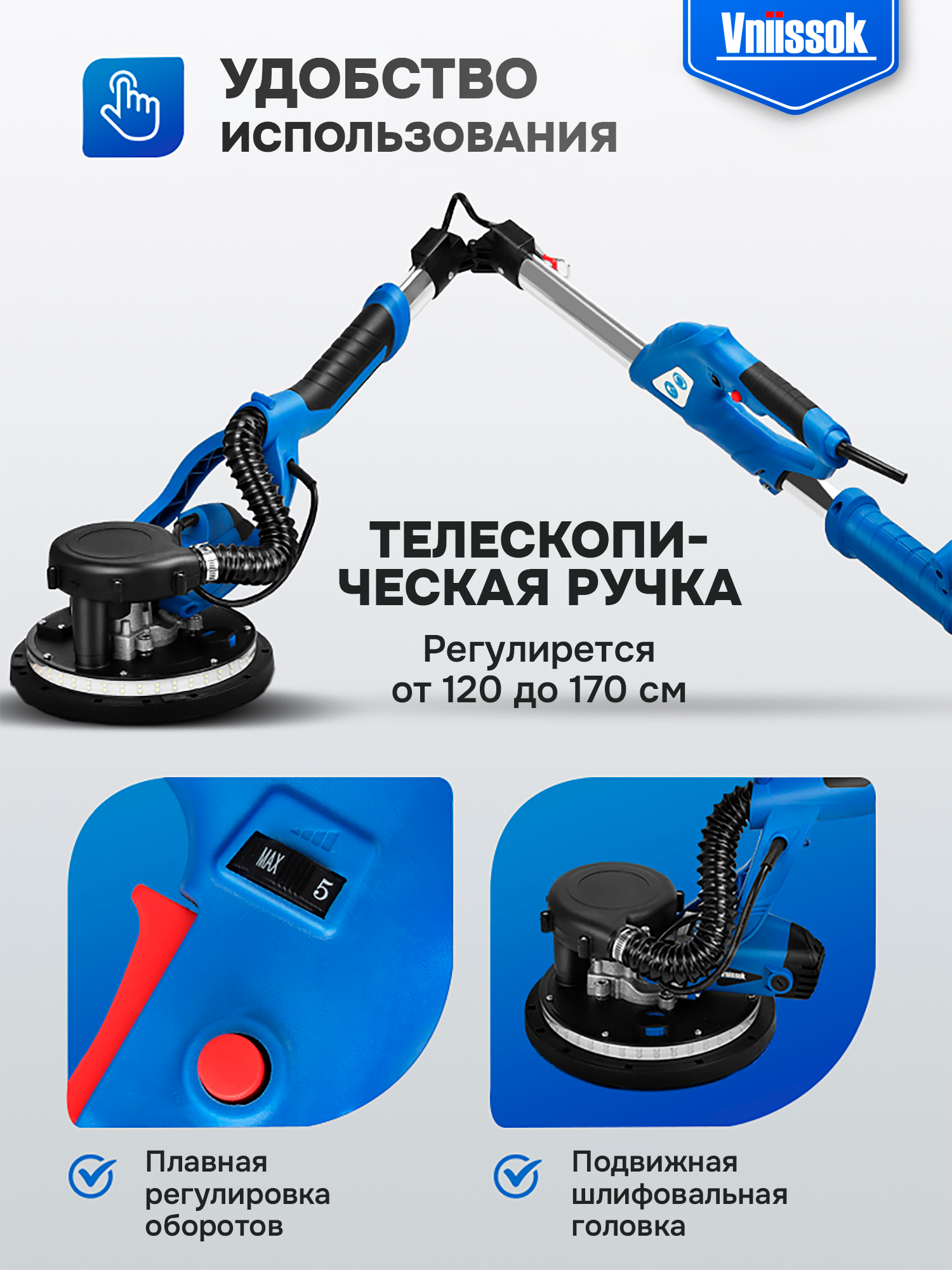 Данная модель оснащена телескопической ручкой, длина которой регулируется от 120 см до 170 см, что делает шлифмашину удобной для работы на высоте более 3 метров. Кроме того, шлифовальная машина типа жираф VNIISSOK V1002 оборудована круговой LED подсветкой (360 градусов), что облегчает работу в условиях недостаточной видимости, позволяя лучше отсматривать неровности обработки, для их устранения. Шлифмашина V1002 имеет удобную облегчённую разборную конструкцию, позволяющую комфортно транспортировать устройство.
