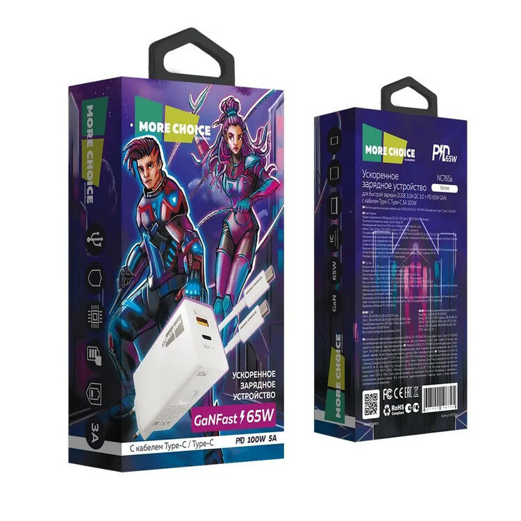 Сетевая зарядка с портом Type-C More Choice NC76Sa 65W Power Delivery Type-C и USB-A White + кабель USB-C — Type-C 100W 1 метр: сравнение цен, характеристики, фото, актуальное наличие и цены.