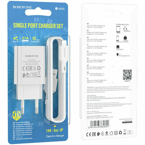 Зарядное устройство Borofone BA68A Glacier, белый (1xUSB, 2.1A, кабель 8pin). BOROFONE BA68A Glacier сетевое зарядное устройство с выходом USB 5V / 2.1A, вилка EU, набор с кабелем для Lightning. 1. Материал изготовления: огнестойкий ABS + PC. 2. Выход: USB-A – 5V / 2.1A. 3. Вилка EU. 4. Размеры зарядного устройства: 83*35*23мм. Вес зарядного устройства: 27г. Вес набора с кабелем: 41г. 5. Набор с кабелем 1м для Lightning. .