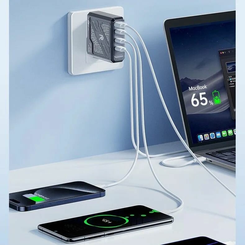 Зарядное устройство GaN4 для телефона имеет 4 порта - 3Type c и usb и даёт возможность безопасно, быстро и эффективно заряжать сразу 4 устройства. Новая технология GaN4 (нитрид-галия полупроводник) обеспечивает мощность 120W, что позволяет с легкостью заряжать не только одно, а целых четыре устройства одновременно. Вы можете использовать один порт USB-A и три порта Type-C для подключения разных гаджетов, и единый интерфейс значительно сократит время, затраченное на зарядку. Блок питания Remax RP-U107 имеет выходную мощность 120 Вт, может заряжать ноутбуки, планшеты и телефоны, а также другие устройства и обеспечивает быструю зарядку. Сетевая зарядка имеет встроенный автоматический определитель мощности. Зарядка на смартфон, устройств андроид, ноутбуков -это мощный, функциональный адаптер, блок питания имеет защиту от перегрева и перенапряжения, что обеспечивает безопасность при использовании. Детали, созданные из альтернативного полупроводникового материала, обладают высокой теплопроводностью, стойкостью к высоким температурам и устойчивостью к кислотам и щелочам. Обладает характеристиками высокой термостойкости и низкими потерями. К зарядке для телефона нужно лишь подключить кабель для зарядки телефона (не входит в комплект). Адаптер USB изготовлен из износостойких материалов - прочного, огнеупорного пластика, что делает его надежным и долговечным. Благодаря компактным размерам, портативную зарядку для телефона можно брать с собой в дорогу. Данный блок питания для телефона пользуется заслуженным вниманием у обладателей всевозможной электроники: смарт-часов, наушников, виртуальных очков, планшетов, мобильных телефонов различных моделей и много другого, всеми кому важна безопасная и быстрая зарядка устройств. Блок для зарядки от сети упакован в фирменную коробку и отлично подойдет в качестве подарка. Мы заботимся о наших клиентах и отвечаем за качество своего товара!