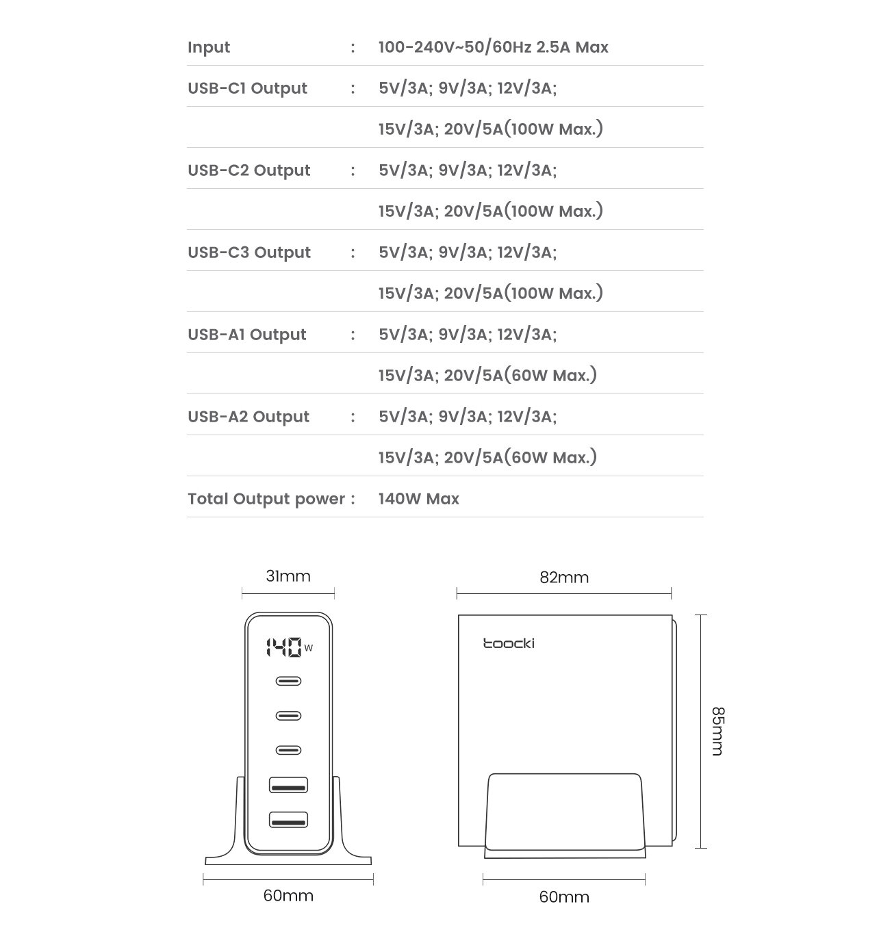 Сетевое зарядное устройство Toocki 140w GaN c быстрой зарядкой (2 USB + 3 USB Type-C TCTZM=YLC01 (цвет белый)