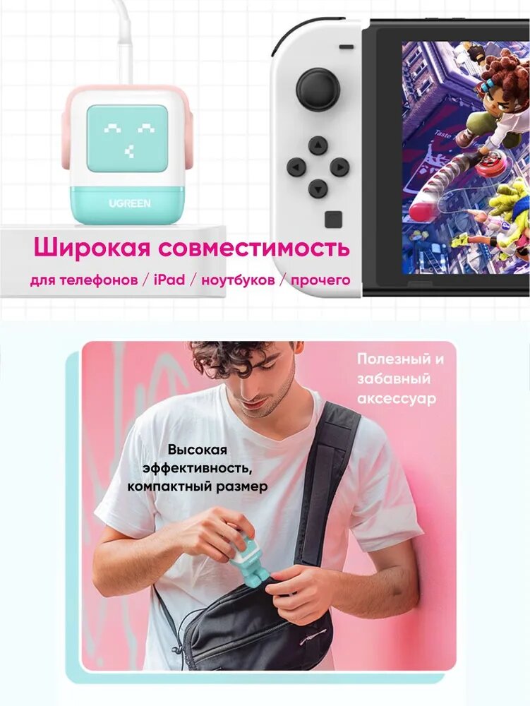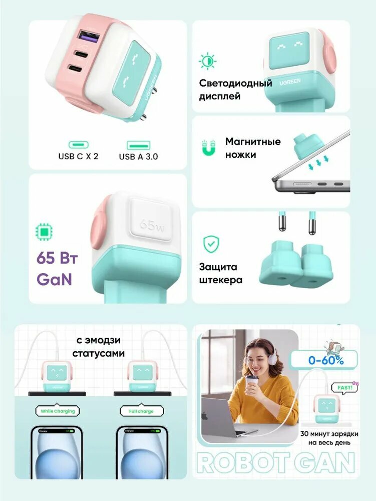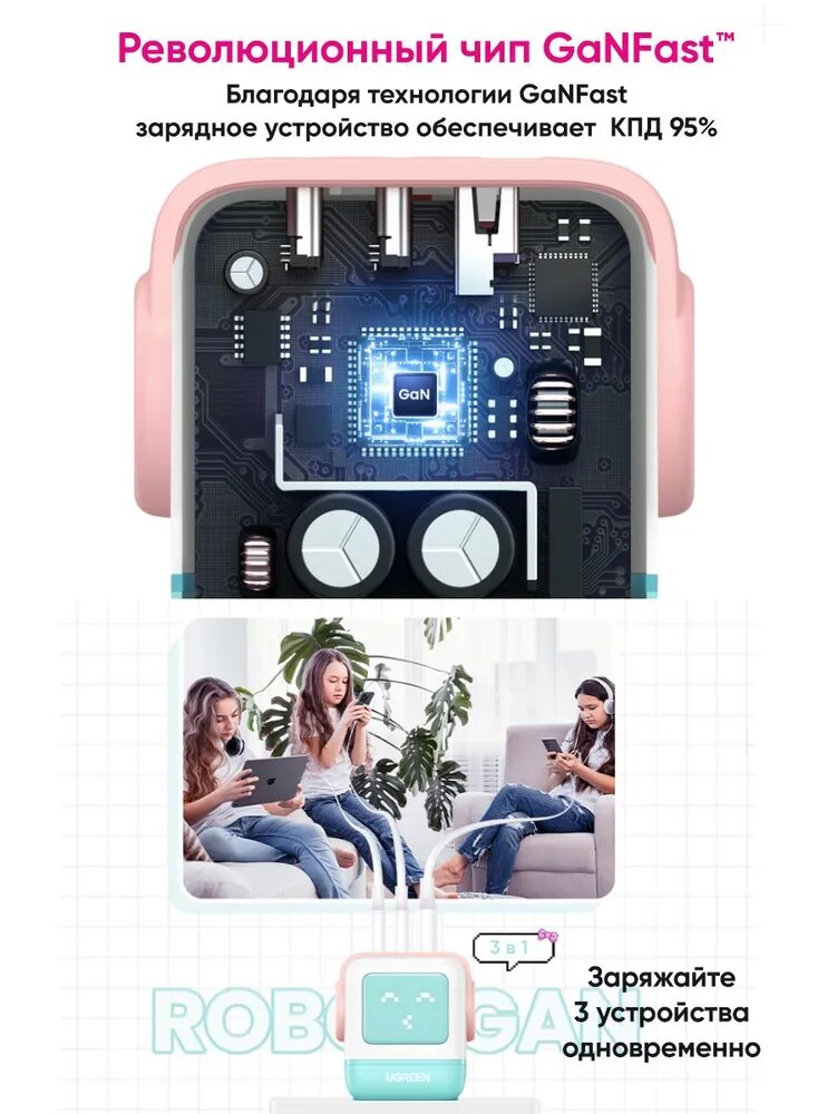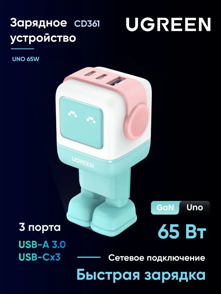 Сетевое зарядное устройство UGREEN CD361 Nexode ROBOT GaN 65W USB-A+2*USB-C розово-синий: сравнение цен, характеристики, фото, актуальное наличие и цены.
