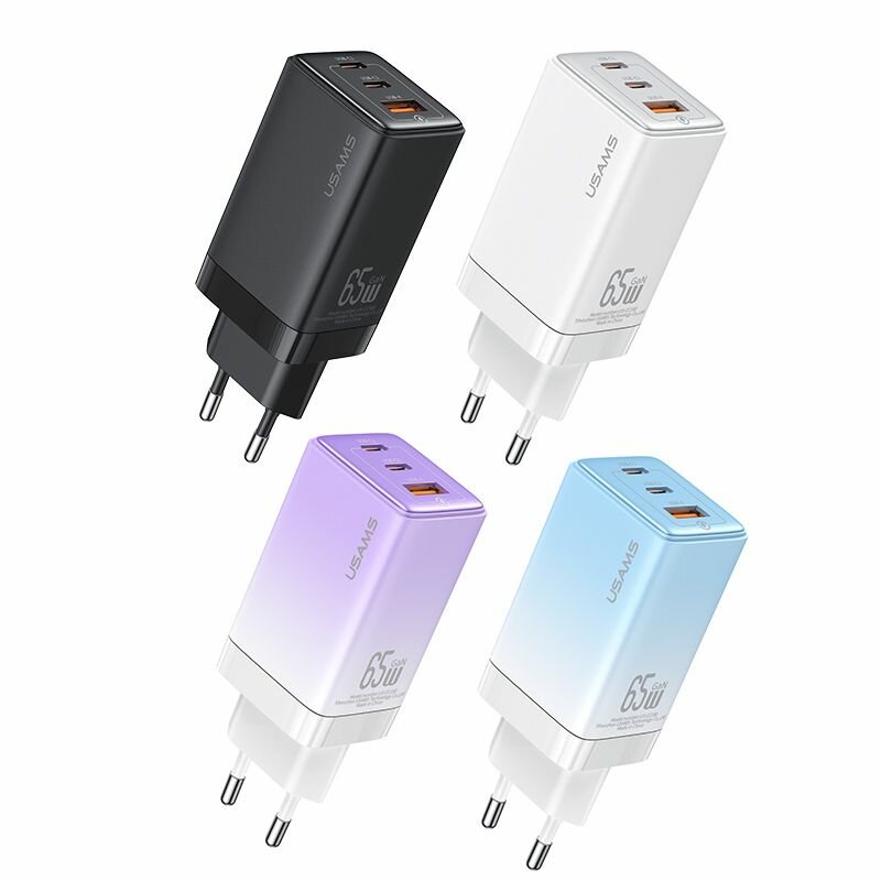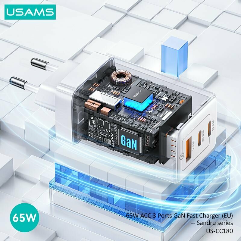 Быстрое зарядное устройство от бренда USAMS с мощностью 65 Вт. Адаптер оснащено смарт-чипом на основе GaN.