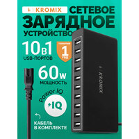 Сетевая зарядная станция KROMIX в чёрном корпусе — это адаптер для телефона, наушников, ламп, смарт-часов и другой техники. Блок питания подходит для питания до 10 устройств. Вы сможете использовать его как зарядку для айфона, Android-смартфонов, планшетов, трекеров и аксессуаров. Благодаря 10-ти USB-портам и суммарной мощности 60 Вт, одно зарядное устройство заменяет сразу несколько.