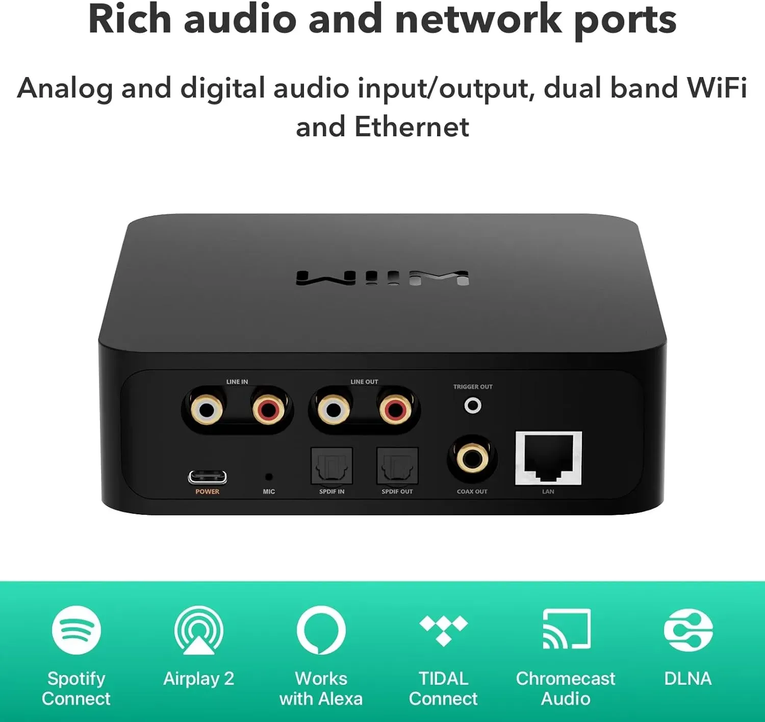 Очень простая система - подключается непосредственно к усилителю или динамику с питанием от сети без внешнего ЦАП. Качество звука сравнимо с WiiM Pro, подключенным к внешнему ЦАП;